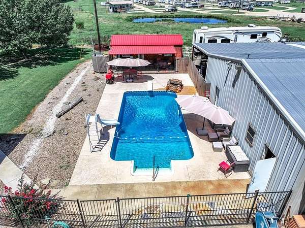 Additional amenities include an in ground swimming pool with diving board and slide, a finished pool house suitable for guests or short term rental use, two RV hookups, two septic systems, multiple storage buildings, and room to expand with additional homes or shops.