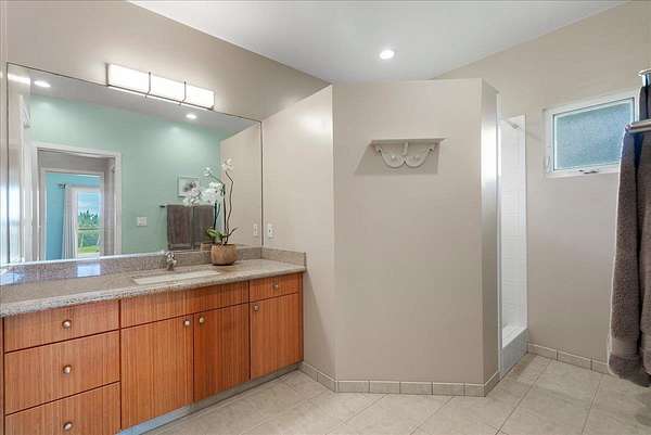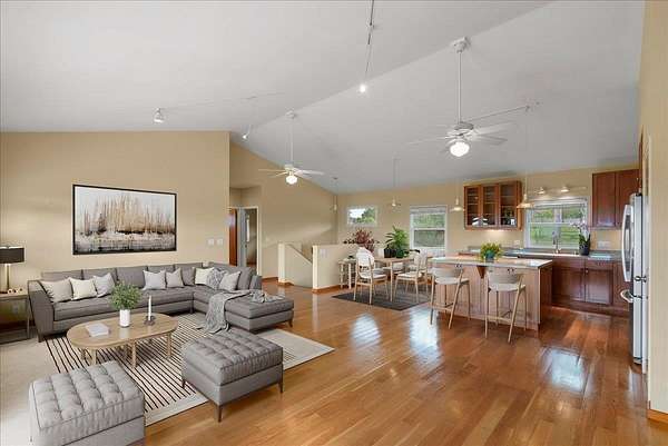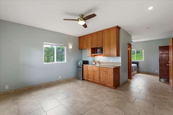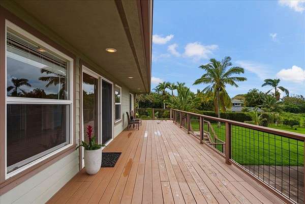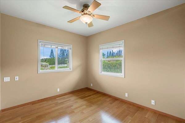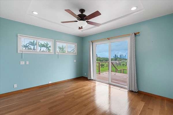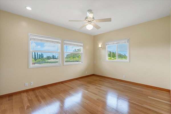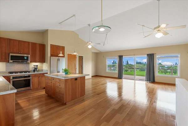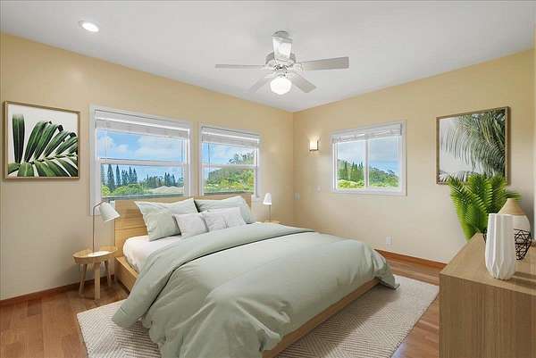 Haiku Mauka Oceanview Home on 2 fenced Acres! Two story Plantation Style inspired living with flexible floor plan: Upstairs 3 bedrooms/2 bathrooms and a large ocean facing lanai. Downstairs features a Bonus private entrance studio bedroom + full bath and wet bar. Ideal for possible income, or room for guests and extended family. Property has views of Haleakala, West Maui Mountains, Giggle Hill, and North Shore Ocean vistas. Home boasts beautiful custom finishes throughout including oak sandwood floors, granite countertops, custom cherry wood cabinets, gas cook top stove, and vaulted ceilings. Luxurious primary bathroom featuring granite counters, bamboo cabinetry, walk in shower, and walk-in closet. Spacious 2 car garage, workshop, laundry area with a half bathroom, and outdoor shower. Unique detached 12 x 20ft Garden Workshop , Established Orchard Trees (tangerine, orange, lemon, lime, mango, grapefruit, & coconut palms), and space to add a detached Ohana. Nestled centrally within the highly sought after Haiku Mauka neighborhood , adjacent to "Giggle Hill" Park in Haiku. Park features an equestrian ring, hiking, community playground, large open space, and event pavilions. This stunning offering is the perfect blend of country living and modern convenience in the Heart of Haiku, a short drive to Shopping, Dining, Gym, Post office and 10 minutes to world Famous Ho'okipa Beach. FURNISHINGS ARE DIGITALLY STAGED. Easy to Show!