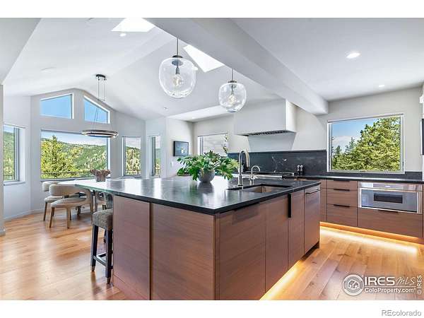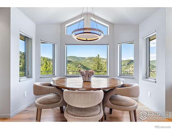 Perched majestically on a mountainside in the serene Pine Brook Hills neighborhood, this mountain luxury retreat at 50 Wildwood Lane is a private sanctuary, meticulously rebuilt and completed in 2023. Offering a seamless blend of natural beauty and modern design, this home features 4 spacious bedrooms, 2 versatile offices or dens, and a home theater room, ensuring ample space for work and play. This residence is designed for those who cherish the best of Boulder's indoor-outdoor living. All main floor living spaces open fully with accordion doors to a sprawling deck, offering massive views and creating an ideal setting for entertaining. The deck is equipped with heaters, fans, a gas grill, firepit, and retractable awning for year-round enjoyment. Inside, the eat-in kitchen shines with vaulted ceilings and skylights, fitted with premium appliances and a cozy breakfast nook. A two-sided fireplace elegantly separates the dining area from the great room, which features a wet bar and expansive windows and doors framing the breathtaking vistas. The main floor primary suite is a secluded haven, complete with a fireplace, his and her walk-in closets, a private patio, and a spa-like oasis of a bathroom. An adjacent den enhances the private quarters, offering additional flexibility. Upstairs, a home office, three secondary bedrooms all with ensuite baths, and a theater room cater to every need. Where refined design meets intelligent living, this home is fully Control4 automated. Don't miss the home gym in the detached garage area or flat grassy yard adjacent to the driveway. Conveniently located just 5 minutes from Broadway, yet a world apart, this home offers the pinnacle of mountain living with the utmost privacy on over 3 acres. Welcome to your mountain paradise!
