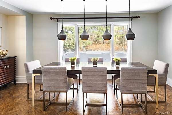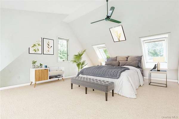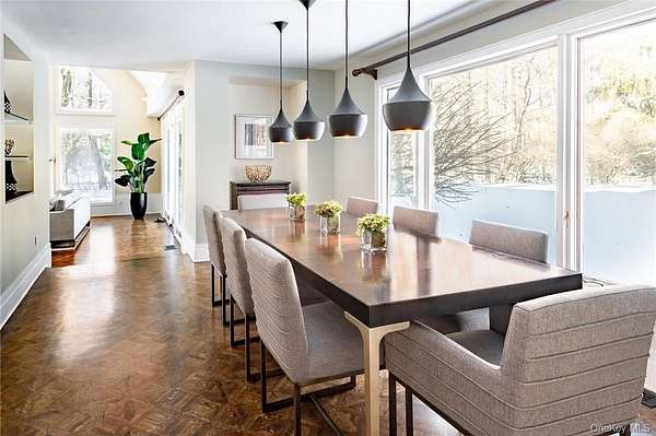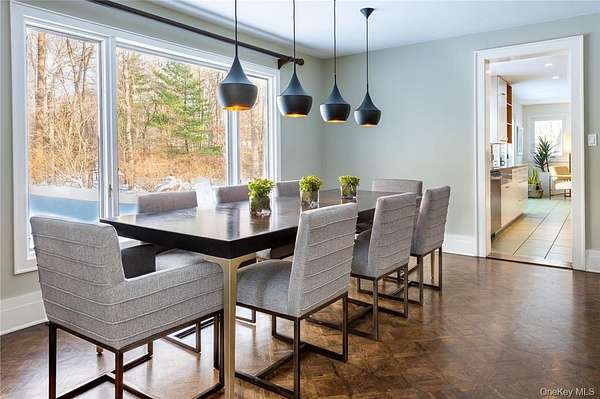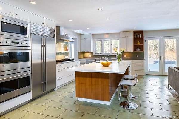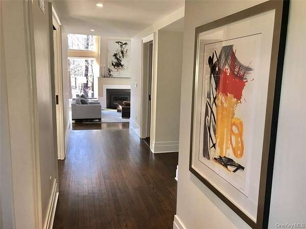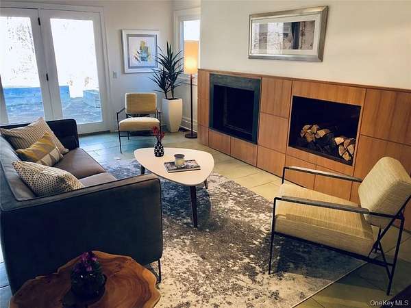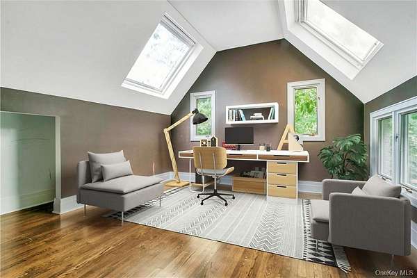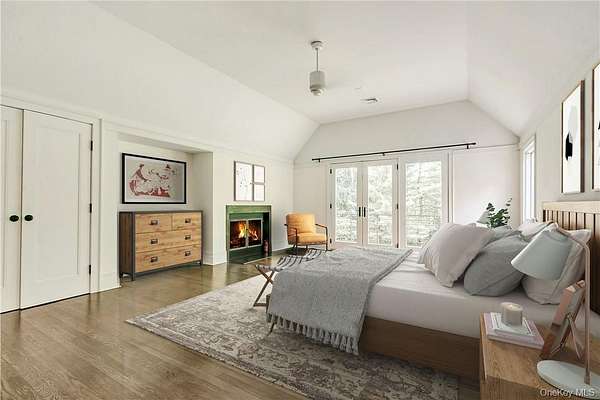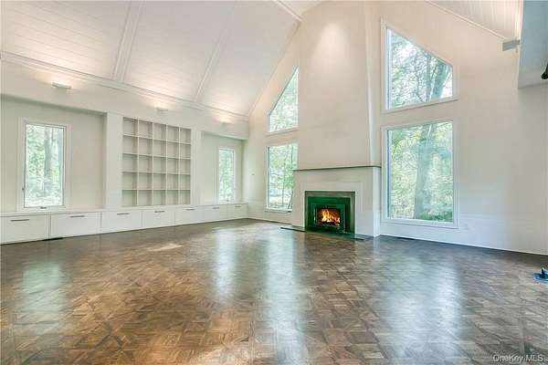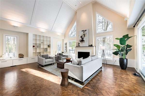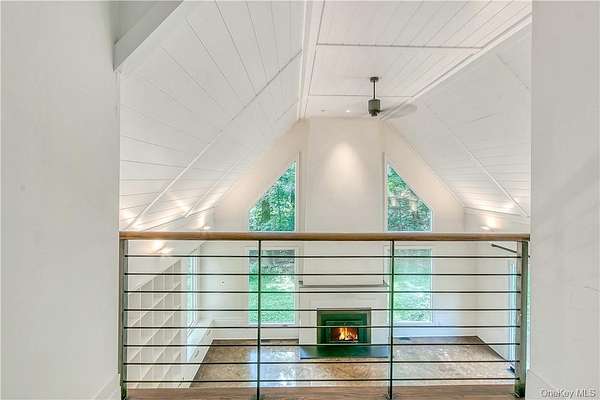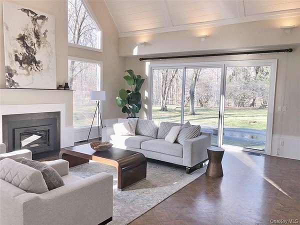 Vineyard House is a striking architect-driven contemporary residence set on two flat, wooded acres in the storied and creative enclave of Snedens Landing, within the Palisades Historic District-just 13 minutes north of the George Washington Bridge. Privately situated on a discreet road that traces the Palisades cliffs and ends in acres of protected hiking trails leading to the Hudson River, the property offers exceptional tranquility and seclusion. Majestic oak and maple trees surround the home, creating a serene natural setting rarely found so close to Manhattan. The residence spans approximately 4,200 square feet and has been thoughtfully renovated with an emphasis on light, scale, and livability. Expansive outdoor spaces-including a stone patio and deck overlooking a broad, level lawn-make the home ideal for entertaining or quiet retreat. At the heart of the home is a large chef's kitchen featuring high-end appliances, custom cabinetry, and a wood-burning fireplace, blending warmth with functionality. A second fireplace anchors the dramatic double-height living room, providing both visual impact and comfort, while a third fireplace enhances the primary bedroom suite, offering a private, cozy escape. The home offers five bedrooms and four-and-a-half bathrooms, including three en suite bedrooms and a first-floor au pair or guest room. Quality-of-life features include ample built-in storage, a two-car garage, mudroom entrance, and seamless indoor-outdoor flow. The grounds are further enhanced by an arbor and lush wildflower gardens. Residents enjoy a short walk to the Hudson River, access to private Snedens Landing Tennis (via the Snedens Landing Tennis Association), and immediate proximity to hundreds of acres of protected wilderness. The setting is peaceful, private, and elegant-yet remarkably close to New York City. Snedens Landing is renowned for its deep cultural and artistic legacy, long attracting actors, writers, dancers, painters, sculptors, and leaders in their fields. The community offers a rare balance of discretion and connection, allowing residents to be as private or social as they wish. Vineyard House is truly special-a refined country retreat offering space, nature, and architectural distinction, just minutes from Manhattan.