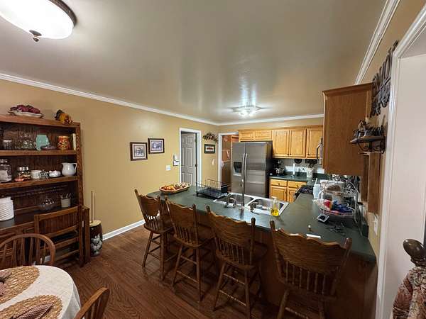 Supporting improvements include barns, utility buildings, and multiple outbuildings that make the property functional for farming, equipment storage, or general rural living.
