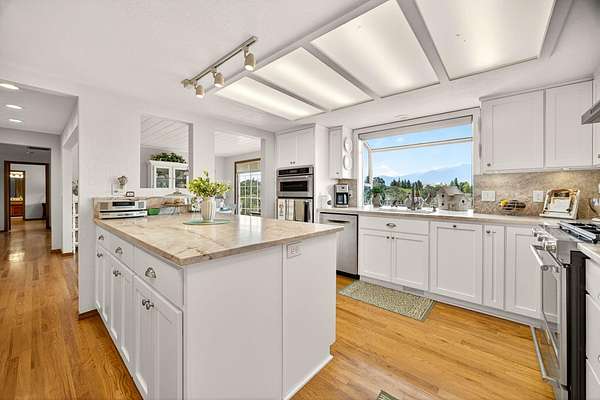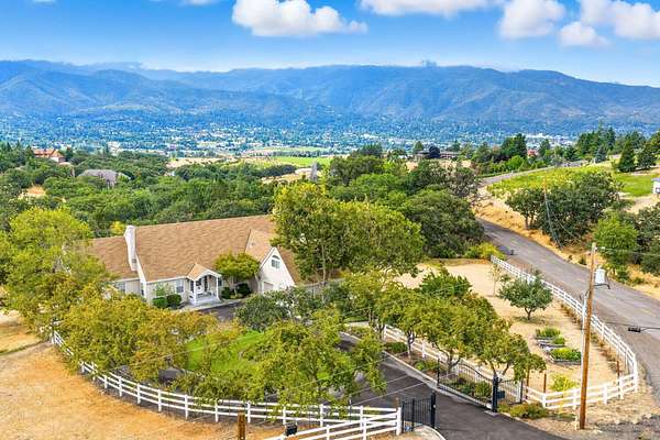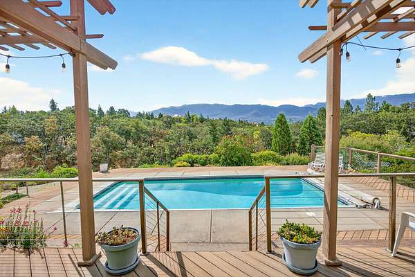 Incredibly desirable Ashland setting--private, quiet & close to town yet distinctly rural. On 5.09 acres with panoramic views of Mt. Ashland & the city, this 3566 sq ft 1985 home offers 5 bedrooms, 4.5 baths & two full primary suites, including a main-level retreat. The main floor features two sitting rooms with wood-burning fireplaces, a living room bar & a 2019 kitchen remodel with quartz leather-finish counters & painted cabinetry. Upstairs features two bedrooms with walk-in closets, a large bath & separate HVAC, plus a guest suite with a loft & window seat. Outdoor amenities: pool with Trex decking, gazebo, apple & plum trees, Gearky Creek, Talent Irrigation water & two workshops (50'x50' & 42'x36'). Other highlights: 2-car garage with workbench, wine cellar, auto generators, water softener, security system & abundant storage. Updates: roof, exterior paint, trellis, decking, railings, pool/spa (2018); HVAC (2019); blinds (2019); electrical/lighting (2018).