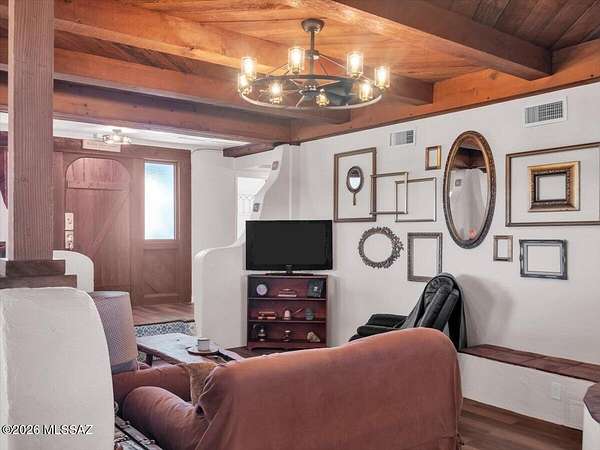 Set on approximately three acres, this property offers privacy, open skies, and expansive 360 degrees mountain views in a peaceful, natural setting. The home features a sunken living room with generous space for gathering, a large kitchen with travertine countertops, and a layout suitable for full-time living or extended stays. Outdoors, the property feels like a quiet oasis, with mature shade trees that provide character and seasonal beauty, productive fruit trees, garden beds, a greenhouse, and a private sauna for relaxation. With ample space, storage, and a serene atmosphere, this property presents a rare opportunity for a residence, retreat, or investment.