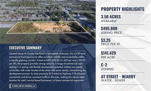 Situated along W County Line Road in Springdale, Arkansas, this +-3.50-acre commercial land opportunity offers excellent visibility and accessibility within a rapidly growing corridor. Priced at $495,000 ($141,429 per acre / $3.25 per SF), the property provides strong value for a range of commercial users seeking C-2 zoning with flexible development potential. Utilities are readily accessible, with water located at the street and sewer nearby, streamlining the development process. Its close proximity (0.2 miles) to Highway 71B enhances connectivity and drives consistent traffic to the area, making this site an ideal location for retail, service-based businesses, or future commercial expansion.