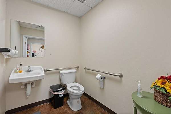 The +-1,872 SF front office-retail area includes two suites that can operate independently, each with its own HVAC and hot water heater, along with three bathrooms and three interior storage rooms with utility sinks. Polished stained concrete floors and 10 dedicated parking spaces make this a flexible option for professional offices or customer-facing retail.