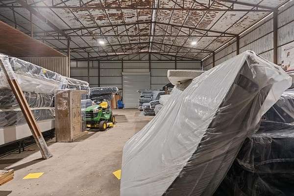 Behind the office are two warehouse buildings: +-3,178 SF with a large roll-up door and +-980 SF of additional space, plus secure fenced storage areas. Heavy-duty iron racks and gated access with barbed wire fencing provide excellent functionality for contractors, logistics-distribution, service businesses, or specialty retail needing both showroom and storage.