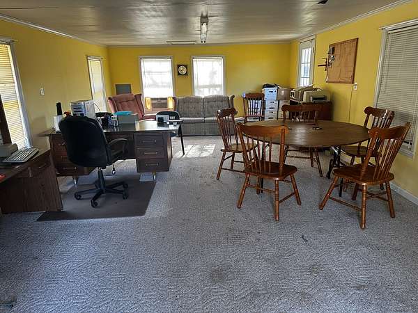 Additional amenities include a 480-square-foot office building, a 2,000-square-foot metal barn for equipment storage, and three smaller storage barns scattered across the property. These facilities enhance the functionality of the estate, making it well-suited for farming, business operations, or outdoor recreational activities.