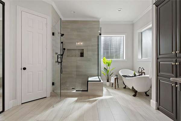 A fully finished, heated and cooled clubhouse with full bath provides versatile space for a media room, fitness studio, executive office, or guest quarters. The adjacent full-size sport court features premium cushioned tile surfacing for basketball, tennis, volleyball, and pickleball, with lighting for evening play.