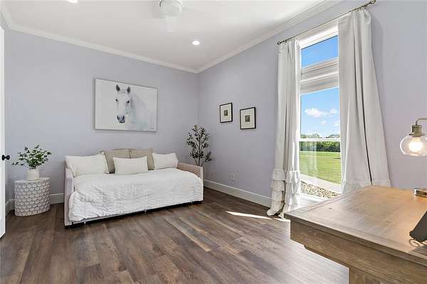 The full 54 acres provide open pasture, a 1.5-acre stocked fishing pond, and a floodable duck slough ideal for waterfowl hunting -- creating a private sporting environment right outside your door.