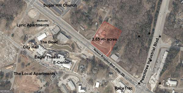PRIME/LANDMARK Corner location in award-winning Downtown Sugar Hill! This high value property brings unique opportunities as it lies within the Town Center Overlay District with NEW Stanley St. Traffic light and UNDER CONSTRUCTION PEDESTRIAN bridge over Hwy. 20! Property sits at the corner of Nelson Brogdon Blvd. (GA Hwy. 20) & Stanley St. which goes through Downtown Sugar Hill and connects to Sugar Hill Greenway and newly built luxury "The Refinery" apartment complex. Commercial/Retail to be built across Stanley St.! This parcel is being sold together along with parcels R7292-089A, R7292-088, and R7272-090 for the total 2.65 +/- acres. This property will put your business in the middle of all the downtown Sugar Hill action happening at The Bowl music venue, The Eagle Theatre, E-Center, retail & restaurants!