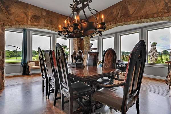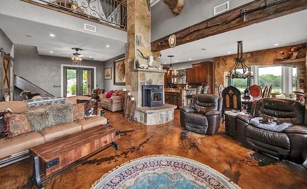 This rustic lodge-style retreat sits on approximately 7.5 acres of open Texas land, set behind a gated entry with a long private drive that gives the whole place a quiet, tucked-away feel. The wraparound porch pulls you in right away, and the outdoor spaces are set up for unwinding with room to grill, gather, or relax under the wide country sky. Inside, the home blends stone accents, stained concrete floors, wood beams, and custom trim, creating warm spaces filled with natural light. The living room centers around a pellet stove and opens to a kitchen that's both stylish and practical with granite countertops, a large island, and stainless-steel appliances.