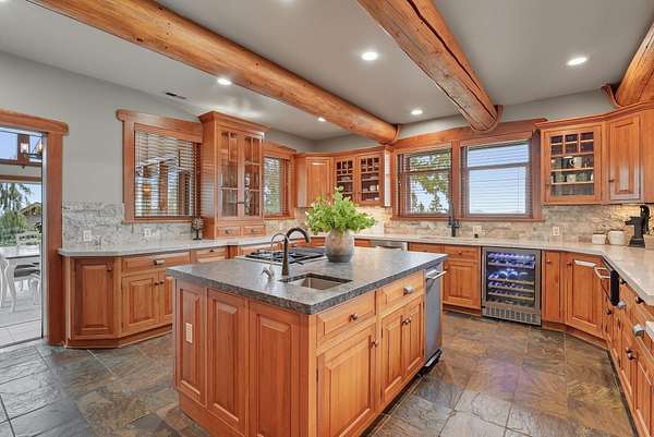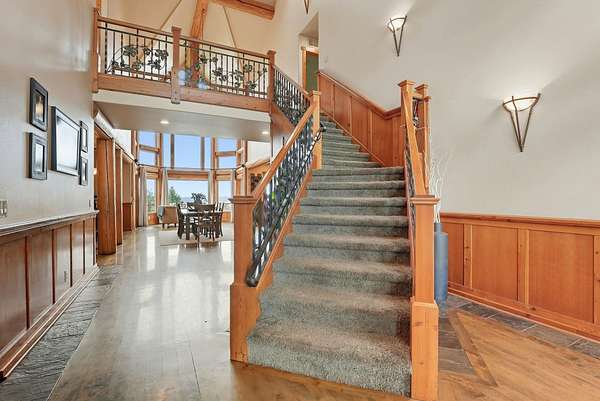 Perched majestically on Mt. Saint Michael, this Yellowstone-inspired luxury estate offers a breathtaking 180-degree view, with architectural and log elements that evoke the spirit of Montana ranches. Featuring grand 35-foot vaulted ceilings and expansive floor-to-ceiling windows, the residence spans 6,685 square feet and includes 5 bedrooms and 5 bathrooms. The master retreat boasts a spacious loft, two walk-in closets, and a fully remodeled ensuite. Complementing the main house are several additional structures: a 28x40 workshop, a 58x40 barn, and a horse setup. Expansive decks provide thousands of square feet for leisurely enjoyment and stunning views, while a fully equipped Accessory Dwelling Unit (ADU) offers 2 bedrooms and a 3-car garage. The estate also features a full-sized fenced regulation tennis court and an exquisite pool, combining luxury with practicality, making it perfect for relaxation and entertaining. Experience rural tranquility with convenient access to Spokane's vibrant cultural scene.