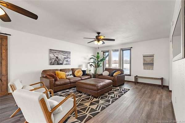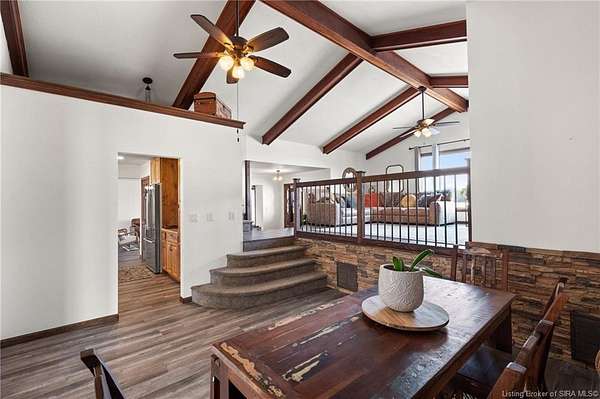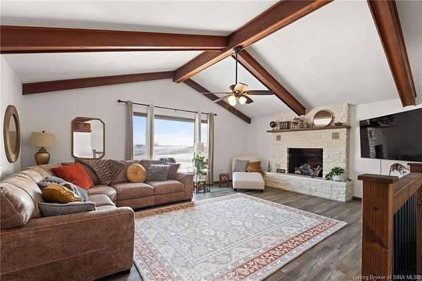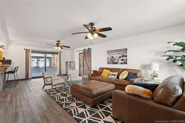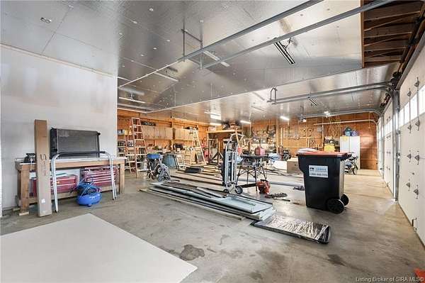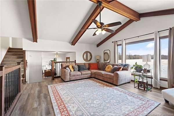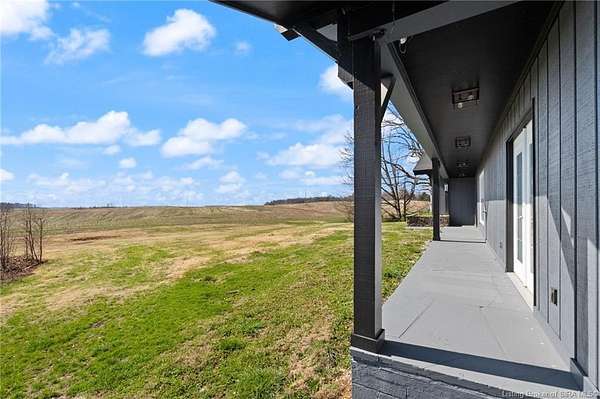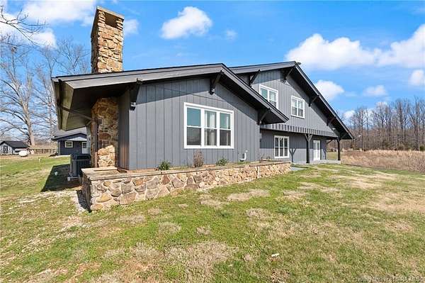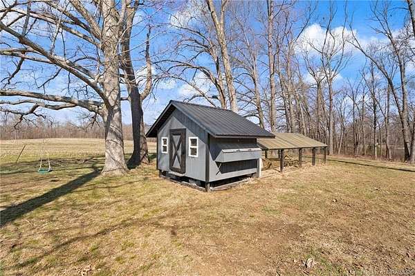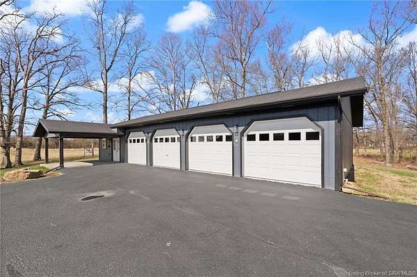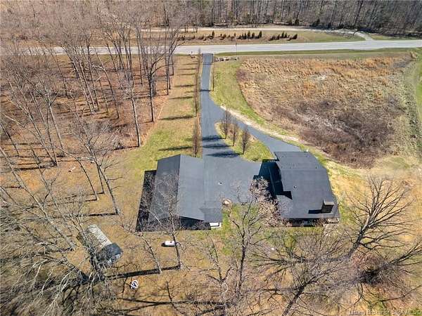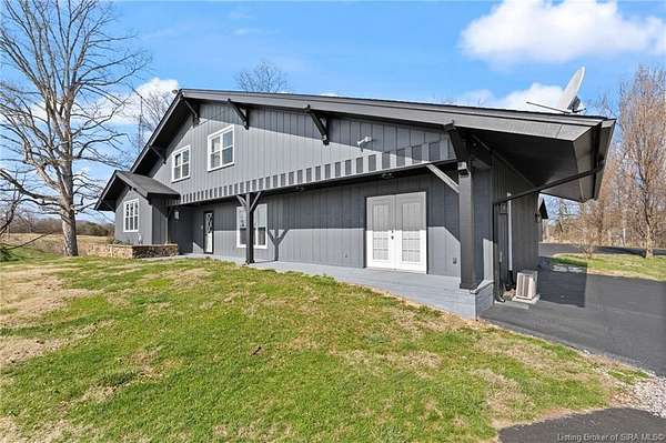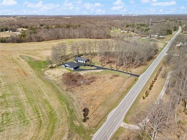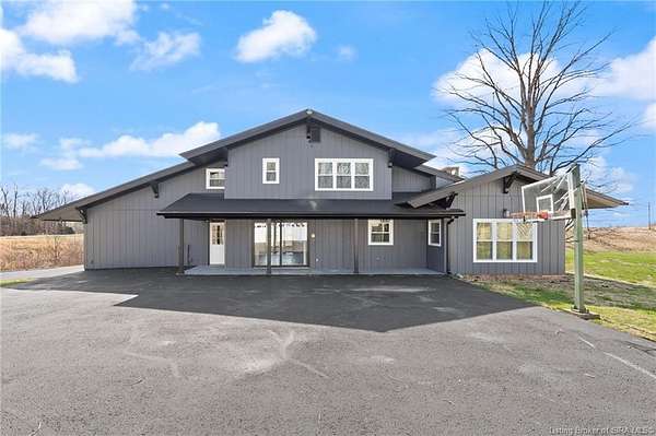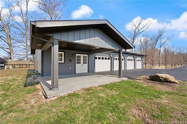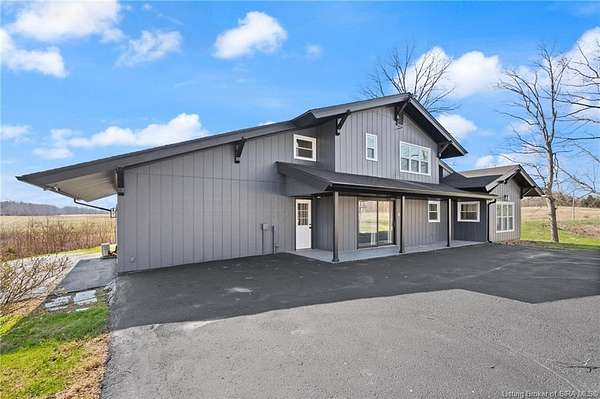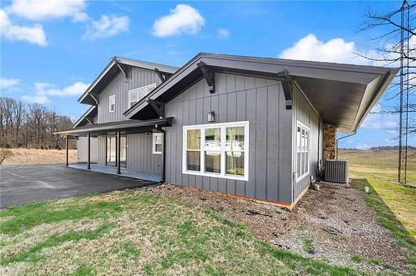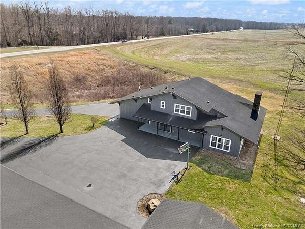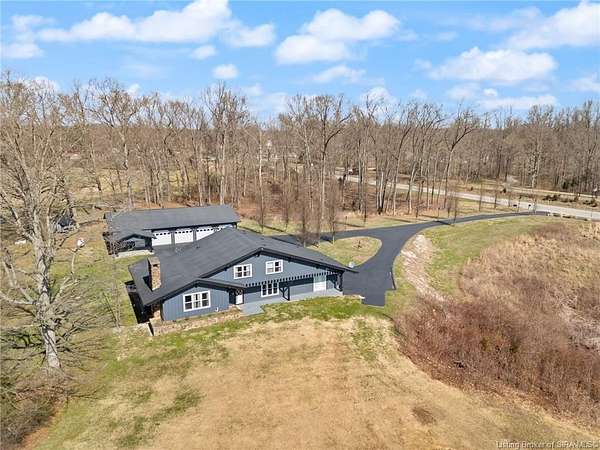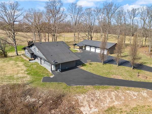This private retreat on 4.88 acres offers breathtaking views and is located just minutes from Spring Mill State Park. This mid-century modern home features 4 bedrooms, 3.5 baths, and 2,996 square feet of living space & 4-car detached garage. The interior boasts spacious rooms with vaulted ceilings, a fireplace, abundant storage, and a convenient laundry/mudroom. The main level includes a primary suite and an additional room suitable for a bedroom or office. The kitchen is equipped with granite countertops, an island, and ample cabinetry. The upper level includes a second primary suite, a large additional bedroom, and a full bath. The property also includes detached quarters featuring a full apartment with a kitchen, living room, bedroom, bathroom, and laundry hookups. Outdoor amenities include a covered patio, garden space, and a chicken coop. The home is conveniently located within 20 minutes of Bedford and Salem, and 45 minutes from Bloomington.