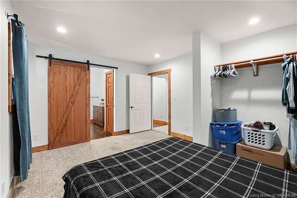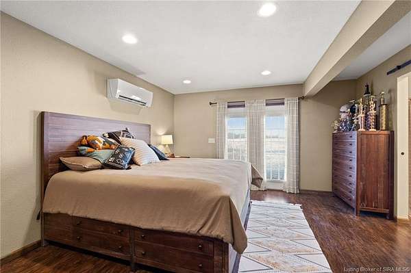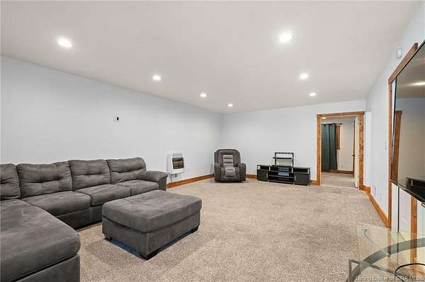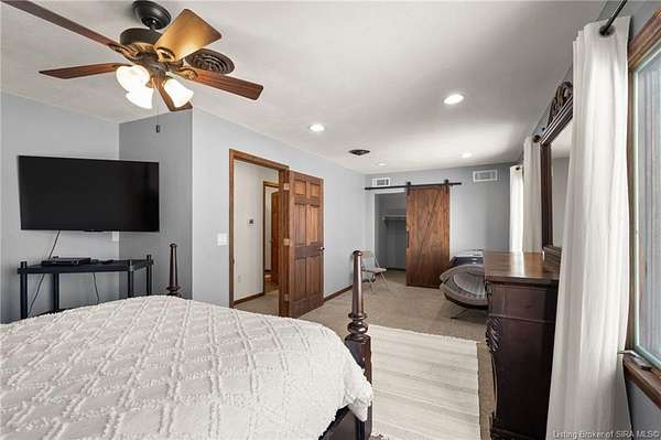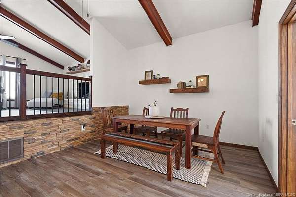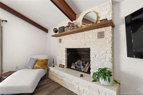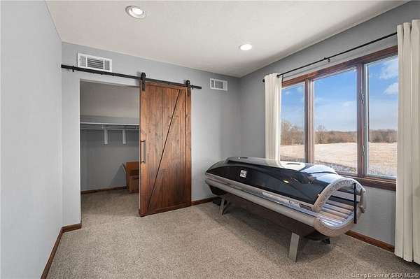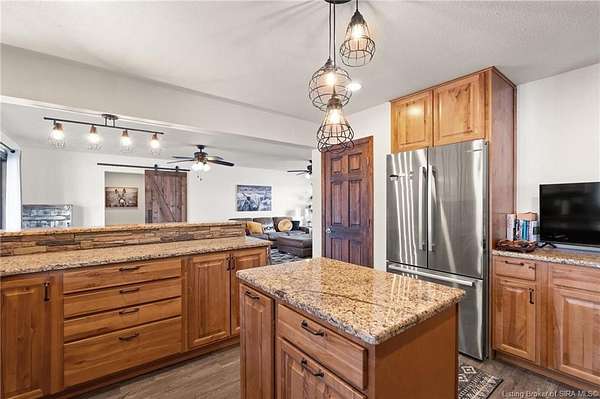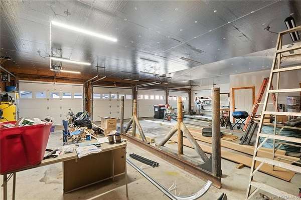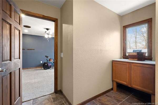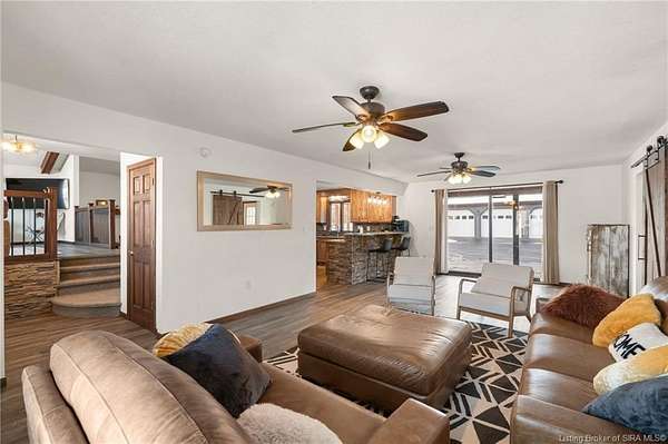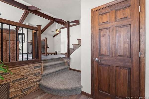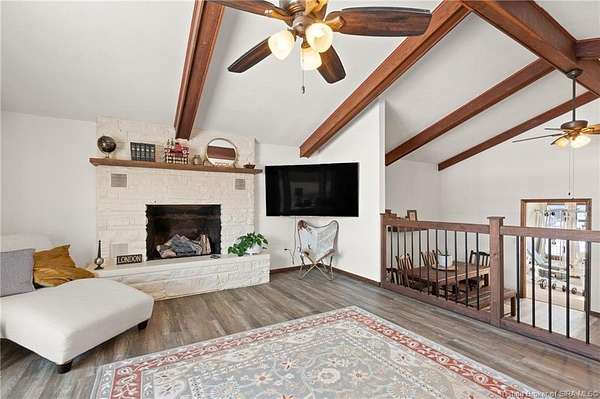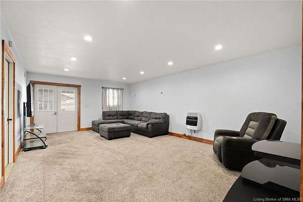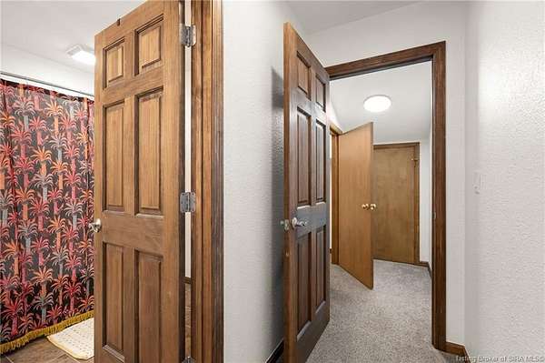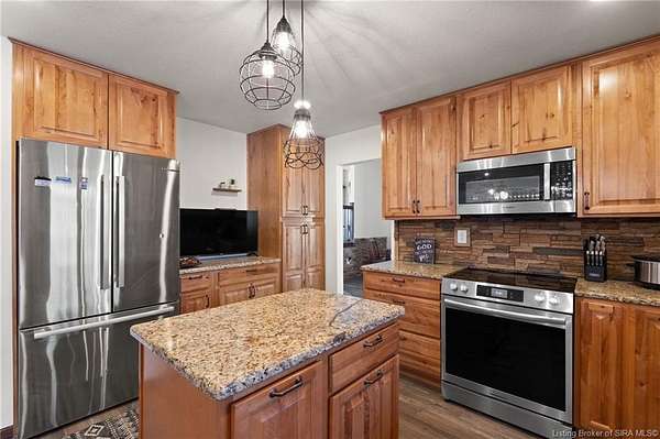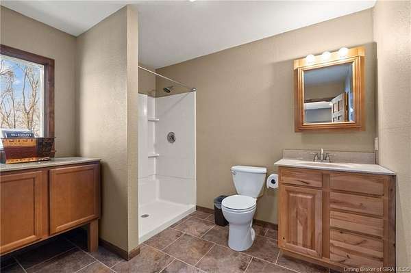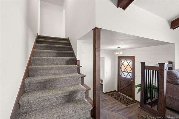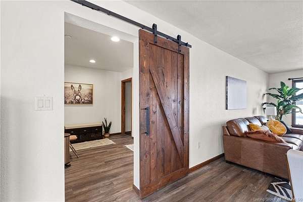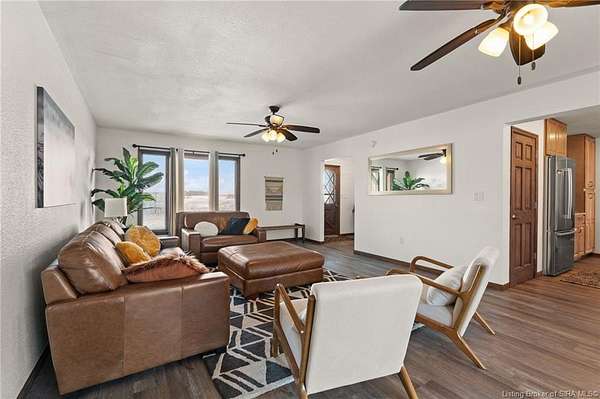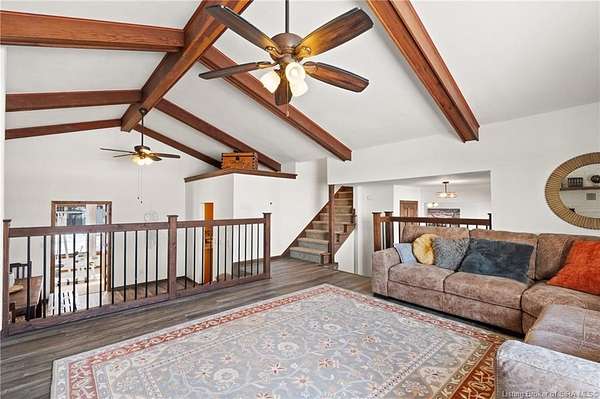 This private retreat on 4.88 acres offers breathtaking views and is located just minutes from Spring Mill State Park. This mid-century modern home features 4 bedrooms, 3.5 baths, and 2,996 square feet of living space & 4-car detached garage. The interior boasts spacious rooms with vaulted ceilings, a fireplace, abundant storage, and a convenient laundry/mudroom. The main level includes a primary suite and an additional room suitable for a bedroom or office. The kitchen is equipped with granite countertops, an island, and ample cabinetry. The upper level includes a second primary suite, a large additional bedroom, and a full bath. The property also includes detached quarters featuring a full apartment with a kitchen, living room, bedroom, bathroom, and laundry hookups. Outdoor amenities include a covered patio, garden space, and a chicken coop. The home is conveniently located within 20 minutes of Bedford and Salem, and 45 minutes from Bloomington.