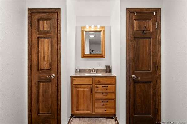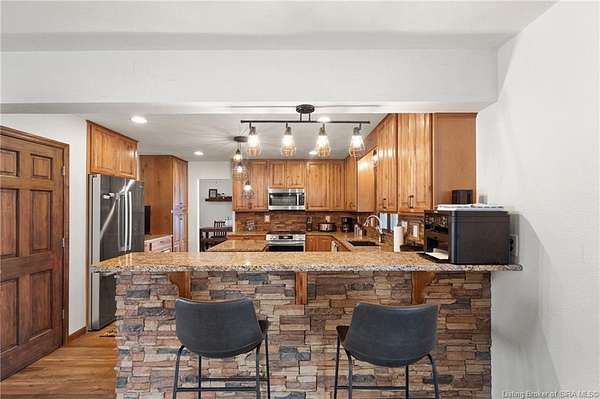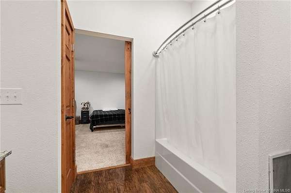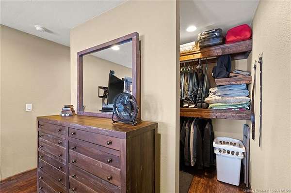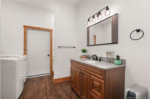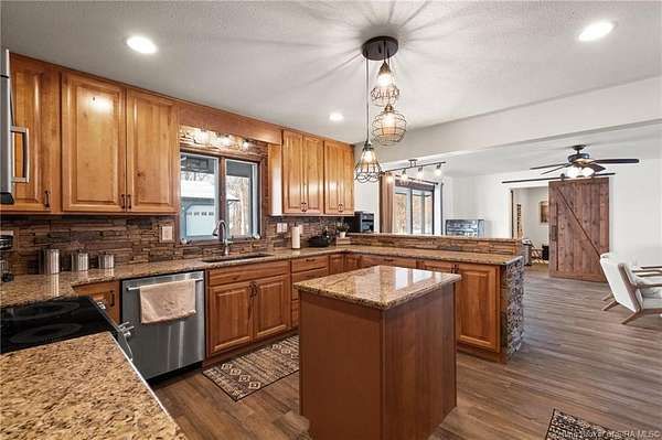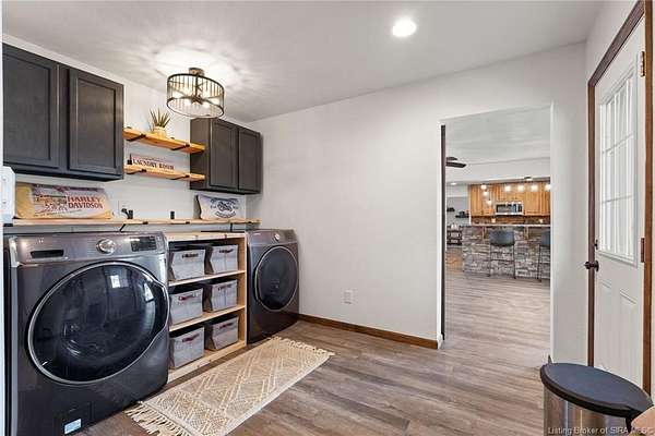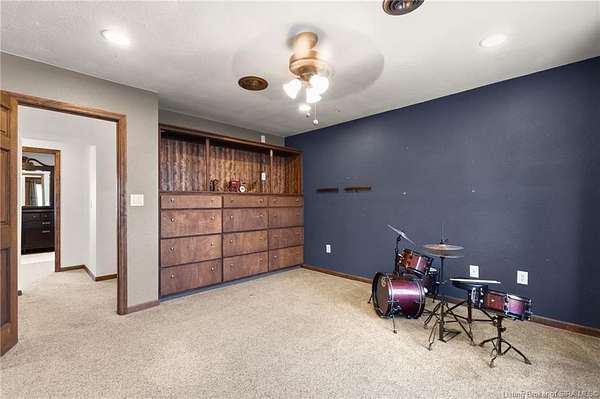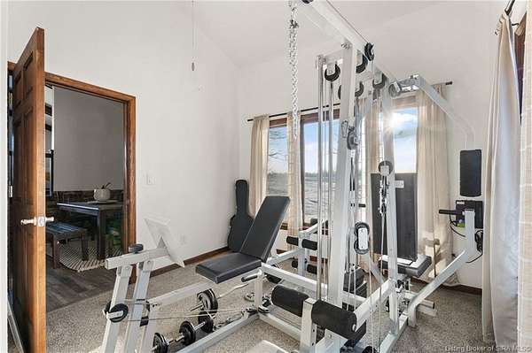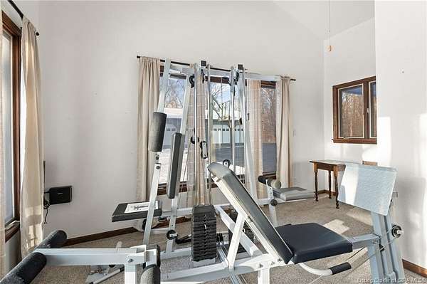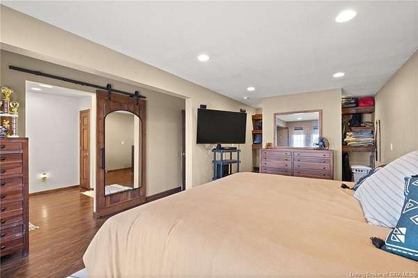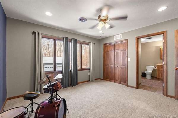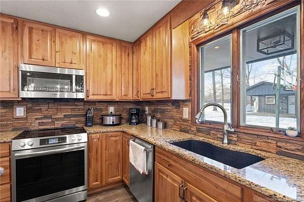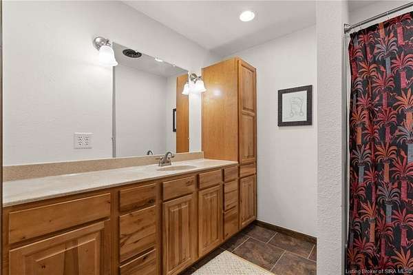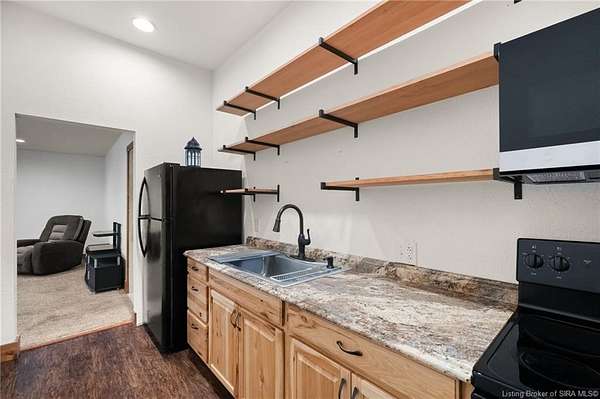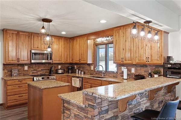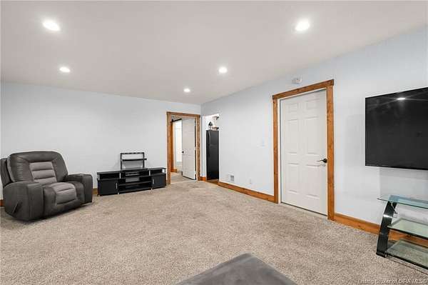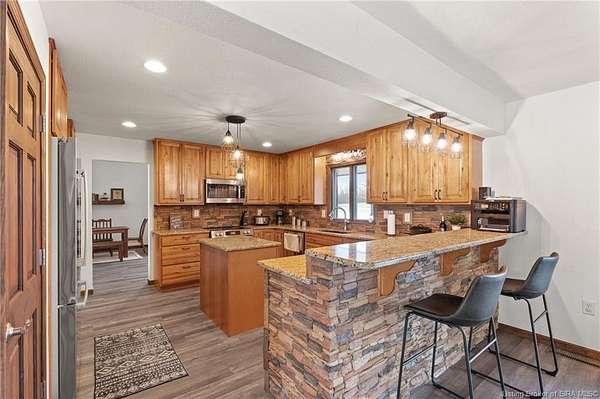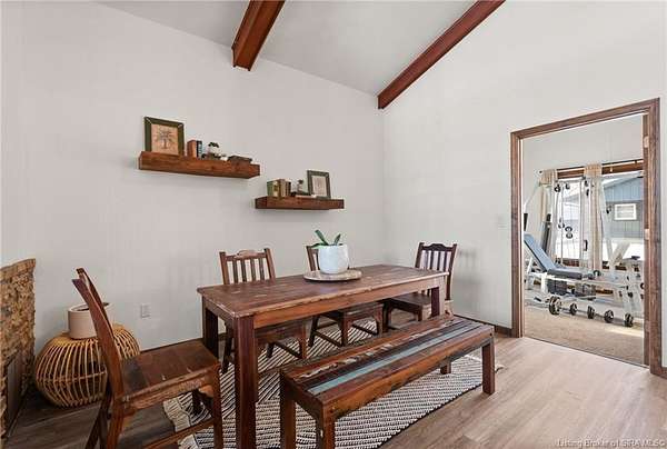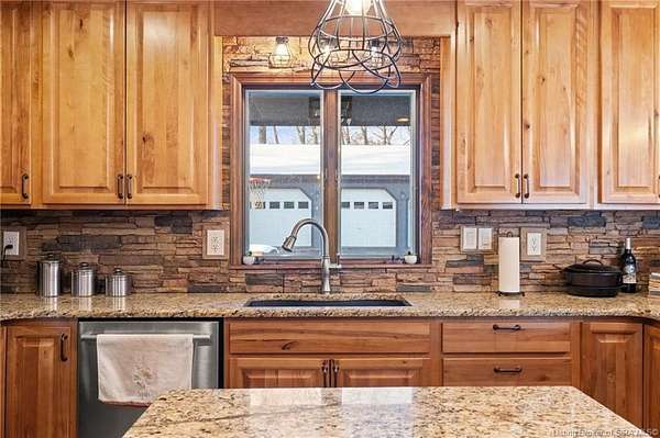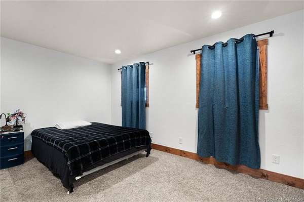 This private retreat on 4.88 acres offers breathtaking views and is located just minutes from Spring Mill State Park. This mid-century modern home features 4 bedrooms, 3.5 baths, and 2,996 square feet of living space & 4-car detached garage. The interior boasts spacious rooms with vaulted ceilings, a fireplace, abundant storage, and a convenient laundry/mudroom. The main level includes a primary suite and an additional room suitable for a bedroom or office. The kitchen is equipped with granite countertops, an island, and ample cabinetry. The upper level includes a second primary suite, a large additional bedroom, and a full bath. The property also includes detached quarters featuring a full apartment with a kitchen, living room, bedroom, bathroom, and laundry hookups. Outdoor amenities include a covered patio, garden space, and a chicken coop. The home is conveniently located within 20 minutes of Bedford and Salem, and 45 minutes from Bloomington.