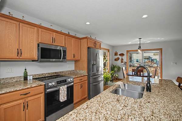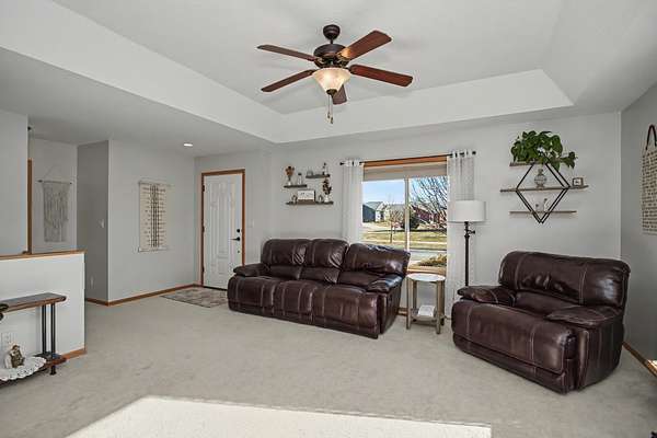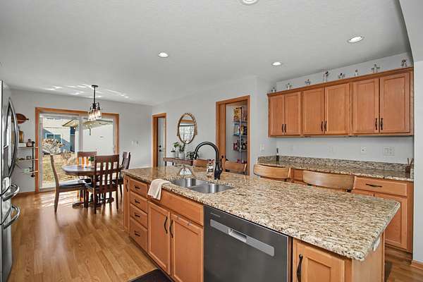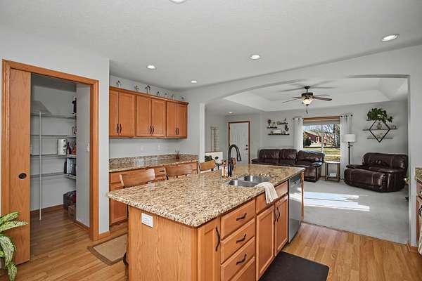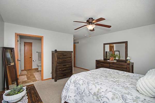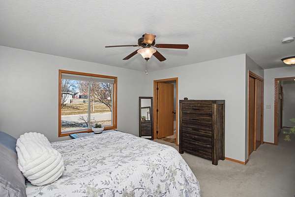 Well-maintained four-bedroom, three-bath home in a desirable Ames location, offering over 2,700 square feet of finished living space. The open-concept main level features tray ceilings and natural light, flowing into a functional kitchen with granite countertops, large island with prep and serving space, walk-in pantry, undermount cabinet lighting, recessed lighting, and generous cabinetry.The main-floor primary suite includes an ensuite with double vanity, massage jet tub, walk-in shower, and linen storage. A second main-floor bedroom, full bath, and laundry add everyday convenience. The finished basement offers two additional bedrooms, a full bath, and a renovated family room with recessed lighting and ample storage.An oversized, temperature-controlled three-car garage features epoxy floors and 10-foot ceilings. Recent updates include a new roof and gutters in 2023. The sale includes an additional 1.3-acre adjoining lot with a pond, creating a rare in-town oasis with uninterrupted views. Sellers may consider separating the lot. Located near west Hy-Vee, Ames Middle School, Highway 30 access, and a walkable neighborhood.