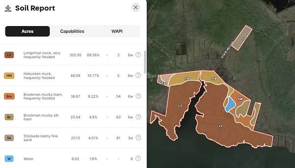 Another distinctive feature is the property's expansive shoreline--over 3.5 miles along the pristine waters of Jones Bay and Drum Creek. The shoreline has two established blinds, with extensive opportunities for more.