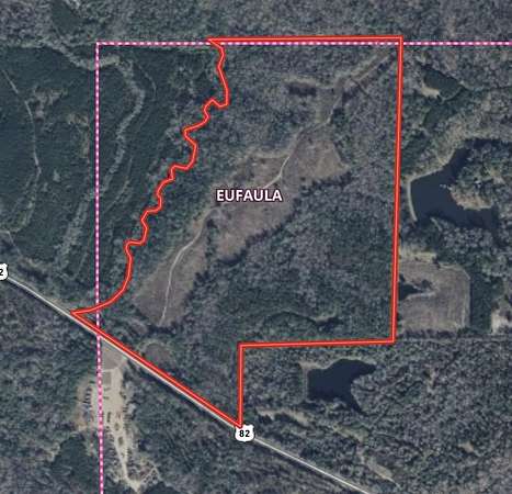 Est $3,755/mo142 acres with 1,800 ft of US Hwy 82 frontage featuring 2 streams, 34 acres of open land, 32 acres of mature hardwoods, and strong deer & turkey hunting. Hardwood draws create excellent habitat, and approx. 140 acres lie within Eufaula city limits. Ideal for recreation, homesite, or investment opportunity.