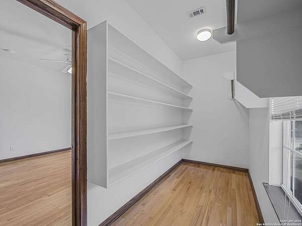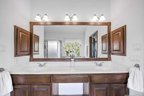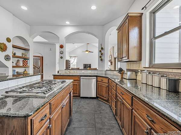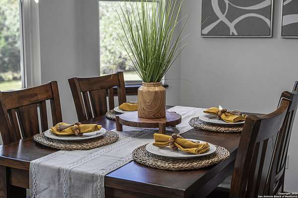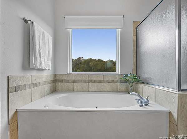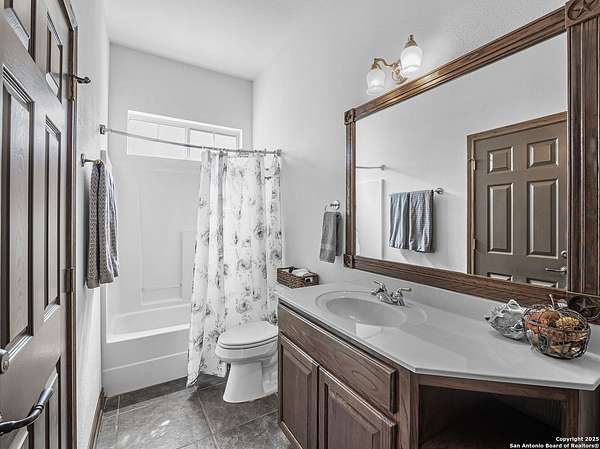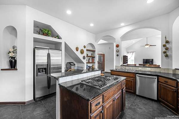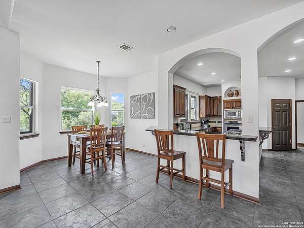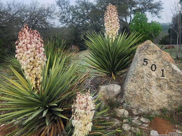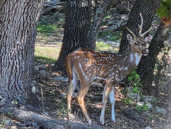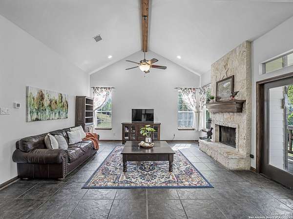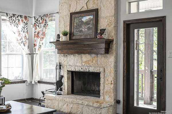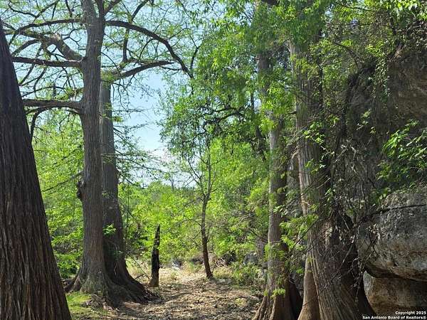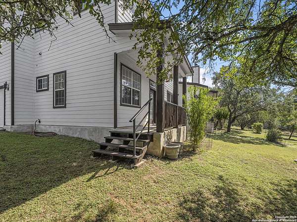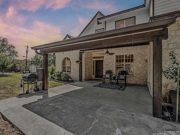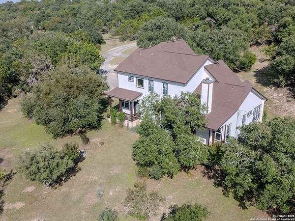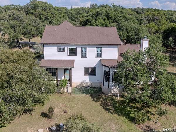 Discover timeless comfort and rustic elegance in this expansive 6-bedroom, 4-bath estate nestled on over five serene acres in the highly sought-after River Mountain Ranch community. Thoughtfully designed for multi-generational living or guest accommodations. This home features three bedrooms and two full baths on the main level, including a private suite with its own entrance, en-suite bath, and covered patio-ideal for long-term guests or an in home office. Wood flooring and tile throughout with high ceilings ads to the open concept and spacious feel. Granite countertops, lots of tall cabinets, central gas cooktop and walk in pantry is a chefs delight. Upstairs, you'll find the primary suite, two additional spacious bedrooms, walk in closets and a Jack & Jill bath. Offering comfort, views of the tree tops, privacy for family and visitors alike. Surrounded by mature native trees and thoughtfully planted landscaping, including various fruit trees. This property offers a tranquil, park-like setting with natural beauty in every direction. Enjoy exclusive access to three private homeowner parks, perfect for outdoor recreation, scenic river access, or peaceful afternoon strolls. Wildlife lovers will delight in the frequent sightings of white-tailed deer, wild turkeys, and other native animals that roam freely across the land where cypress and live oaks grow along the creek. A new water heater was recently installed, several new windows and flooring refinished in the secondary upstairs bedrooms. There's also a chicken coop conveniently on site, just ad the chickens. Experience the quiet elegance and unspoiled charm of Texas Hill Country living-a perfect blend of space, privacy, and community today.