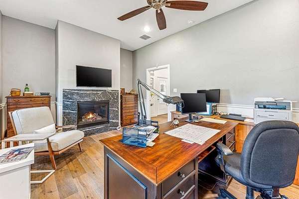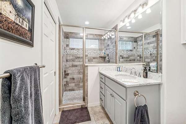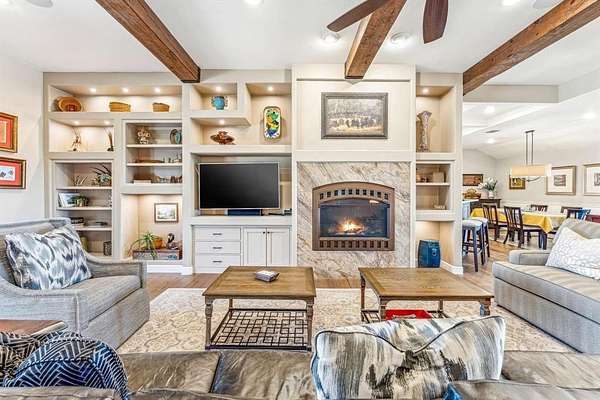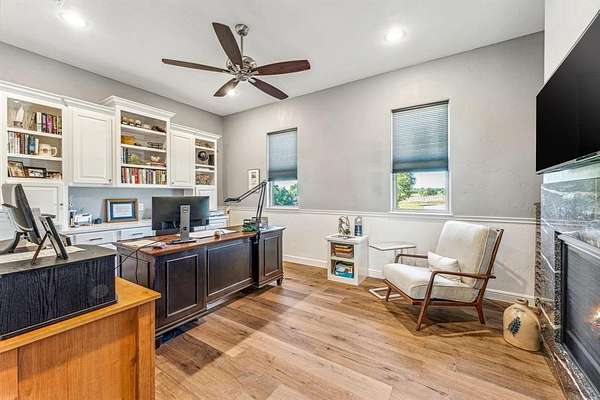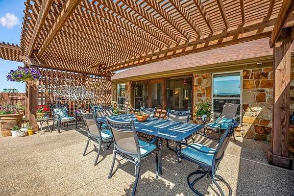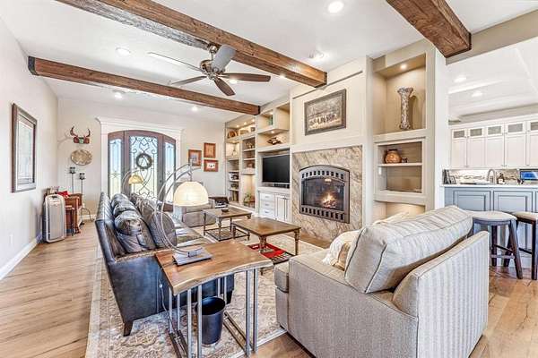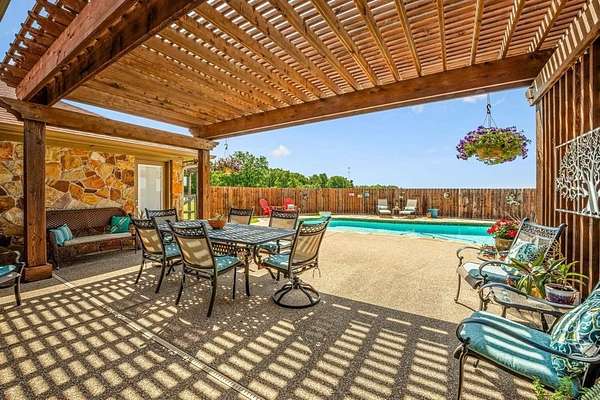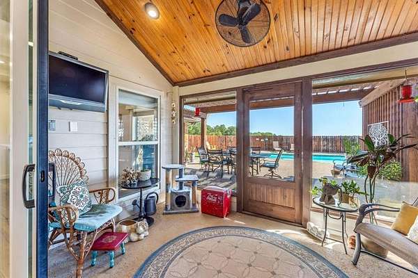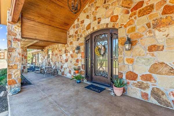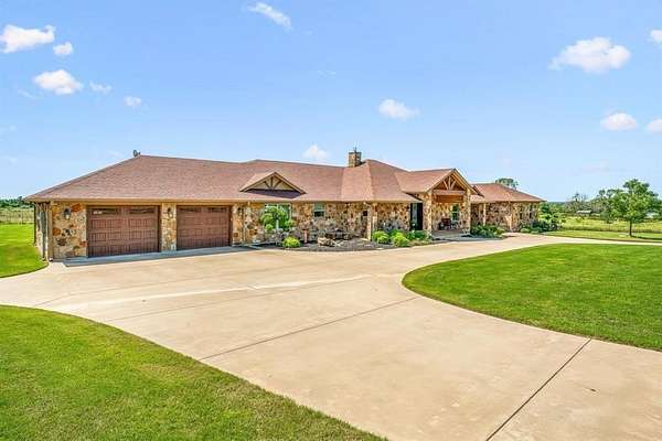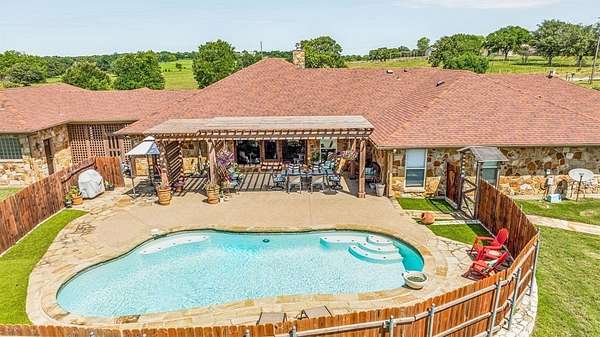 Magnificent Estate nestled on 5-acres in charming town of Granbury perfect for horses. 3714 sq ft Single-level Texas ranch-style home remodeled and expanded in 2017 by Will Steed. The property is completely fenced and the manicured grounds and irrigation system enhances the serene country living. The home features a large semicircular driveway and a lodge style front entry with natural stone masonry, timber accents, and a custom iron and glass door. The interior features hardwood and tile floors in the common areas, carpet in the bedrooms, and high-end quartz, granite, and onyx countertops throughout. The chef's kitchen includes a Wolf professional-grade 4 burners with griddle gas range cooktop, 3 burner Wolf induction cooktop, dual convection wall ovens, warming drawer, built in side by side refrigerator-freezer, blanco sink and custom cabinetry. Adjacent to the kitchen, pantry includes wine storage for up to 350 bottles, and the dining area overlooks the patio, pool, and screened-in porch. The expansive living room features a gas fireplace, hand-crafted wooden beams, and a built-in surround sound system. Sliding glass doors provide access to the 2,133-square-foot pergola patio and saltwater pool area. The master suite includes a walk-in closet, mirrored vanity area, and an exceptional spa bath, including a large double vanity, oversized his-and-her shower, and a separate lavatory room. house features two secondary bedrooms with full baths, a craft studio or could be a 2nd living or play room, oversized laundry room. The West Wing offers a home office, exercise room, a temperature-controlled storage room and a full bath, with potential for conversion into a free-standing apartment. Additional features include a single-stall horse barn, a potting shed, storage building, foam insulation, a tankless hot water system, an advanced well water filtration system and security cameras with remote monitoring. This is truly a very special property and a rare find!
