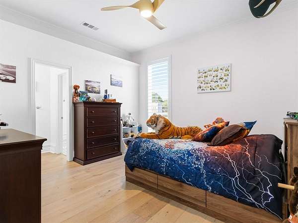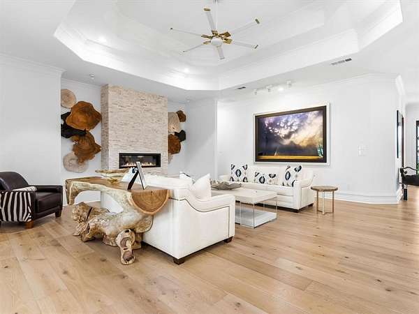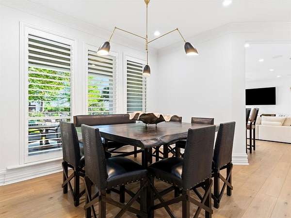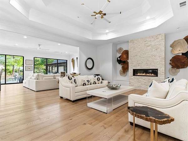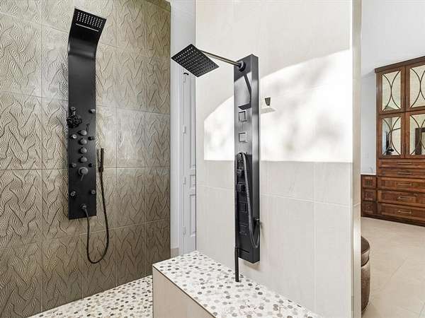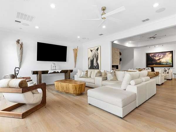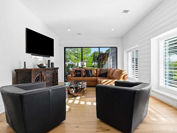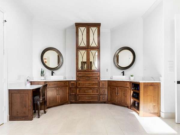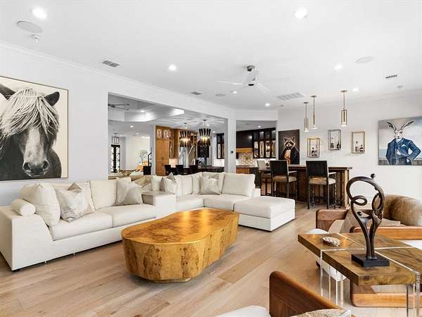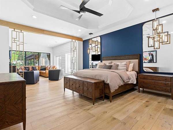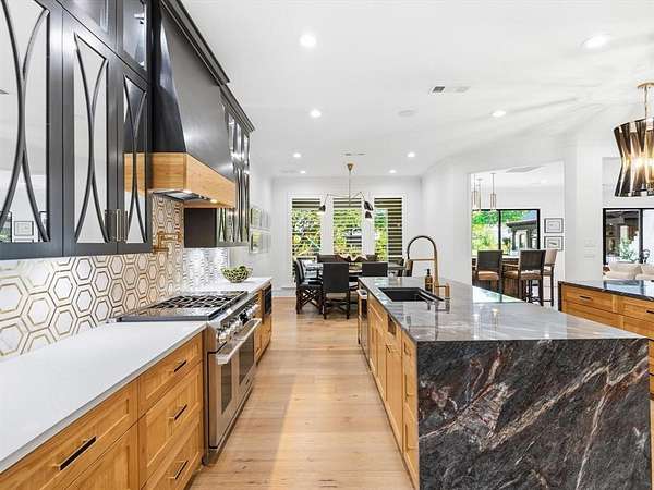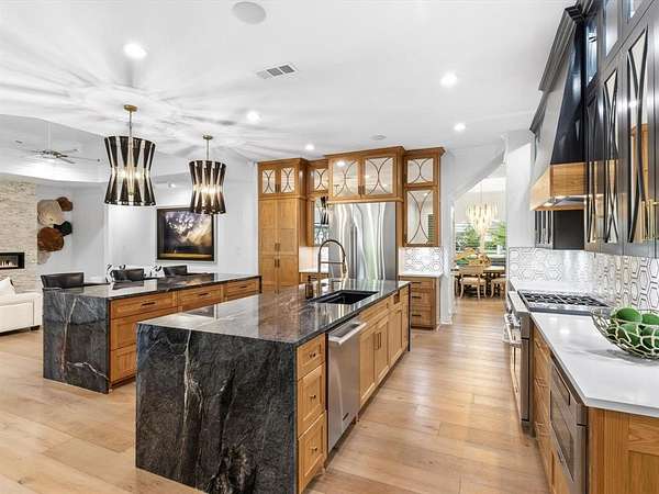 The thoughtfully designed interior offers 3 downstairs bedrooms and 3 baths, with an additional bedroom, full bath and bonus room on the second floor. Natural light, refined materials, and intentional spaces create a seamless balance of sophistication and comfort. At the heart of the home, the chef’s kitchen is a true showpiece, featuring double quartzite waterfall islands that combine striking design with everyday functionality.