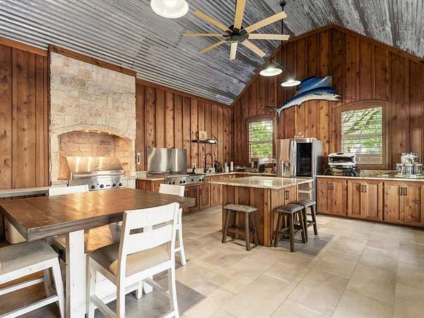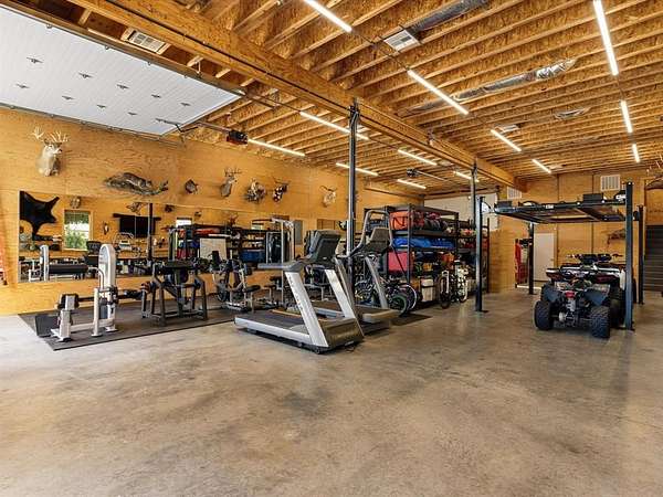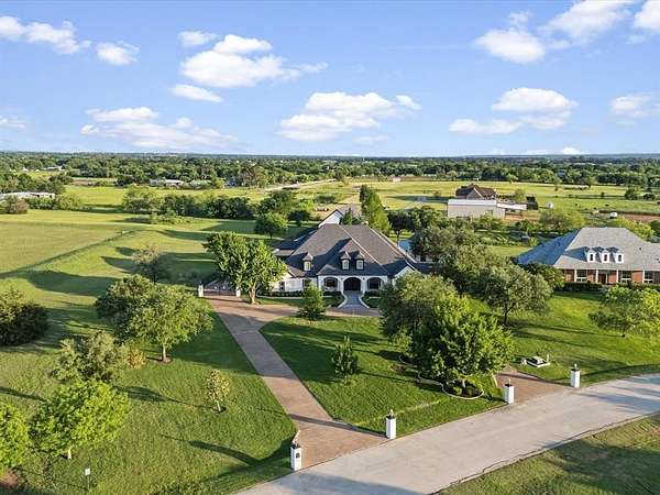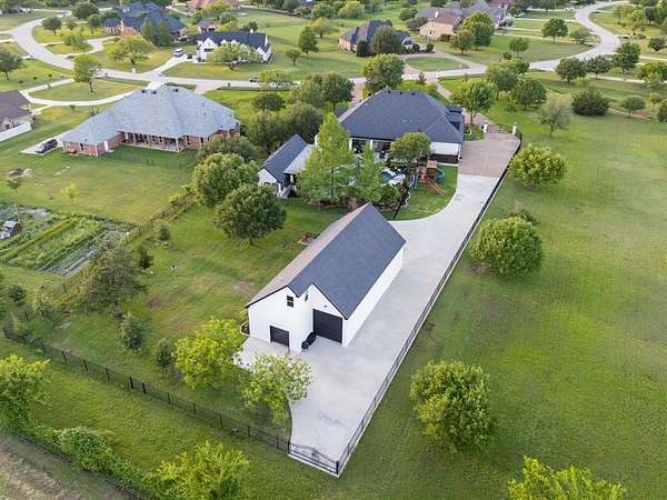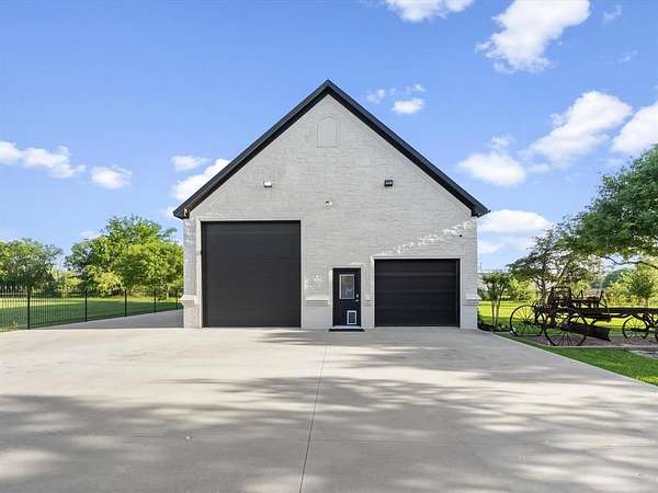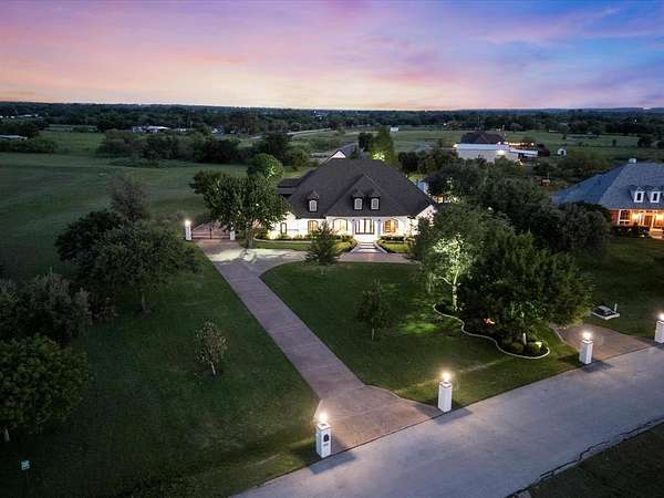 The property is further enhanced by professional landscaping, striking exterior up-lighting, and outdoor natural gas fire pits and spa that create an inviting ambiance for evening gatherings. The fully equipped shop features 14-foot pass-through doors for maximum accessibility. A rare opportunity to own a distinctive North Texas acreage property offering space, versatility, and refined living. New Roof April 2026