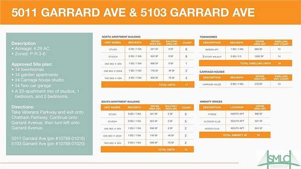 This approved development project is approved for a total of 75 units: 33 apartment units, divided between 2 buildings, "North" & "South" buildings. The North Building includes ground-floor fitness center & rooftop amenity space featuring both indoor & outdoor areas for coffee, work, & socializing. The rooftop offers a dynamic environment for day-to-night use, making it ideal for both relaxation & community engagement. Surrounding surface lots will provide convenient parking, with additional outdoor amenities, including cookout spaces & play areas for residents. The townhouses are thoughtfully designed in pairs, each featuring a garden-level 1BR/1BA flat that can be used as a living space or a flexible work area. Above each flat is a spacious three-bedroom townhouse with a two-car garage in the rear. Additionally, each townhouse has a separate "carriage house" studio apartment above the garage, accessible via a private lane with parallel parking.