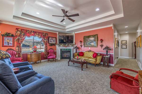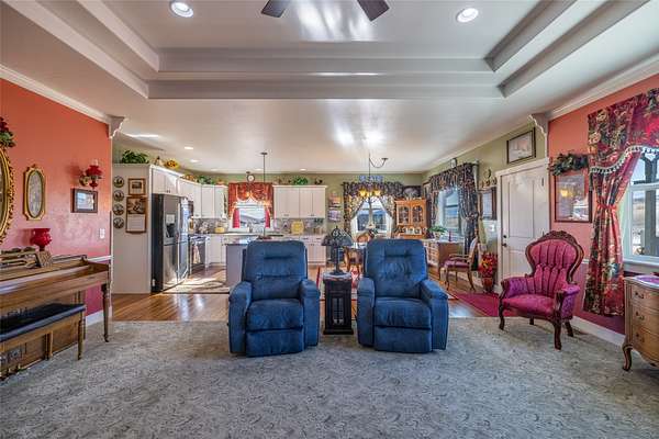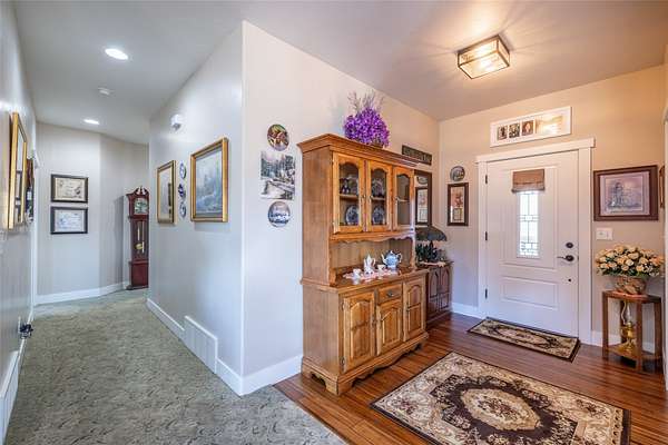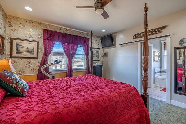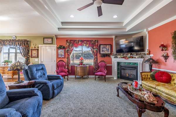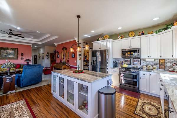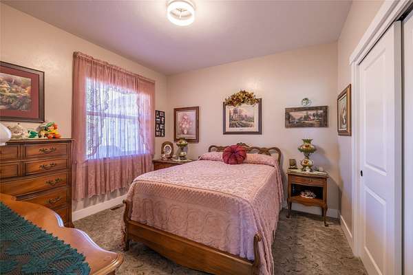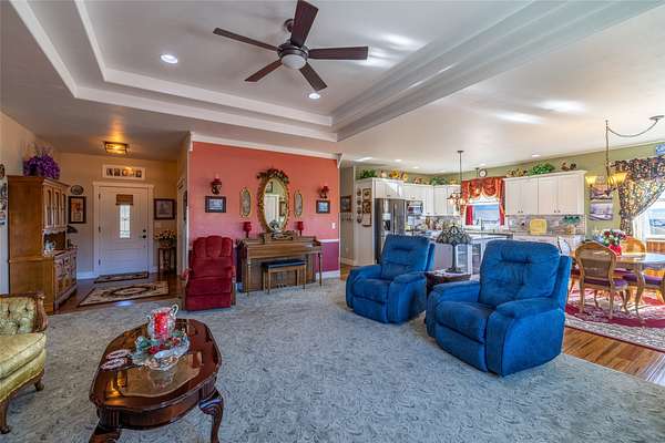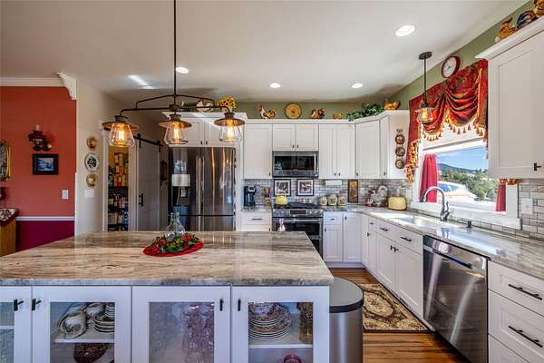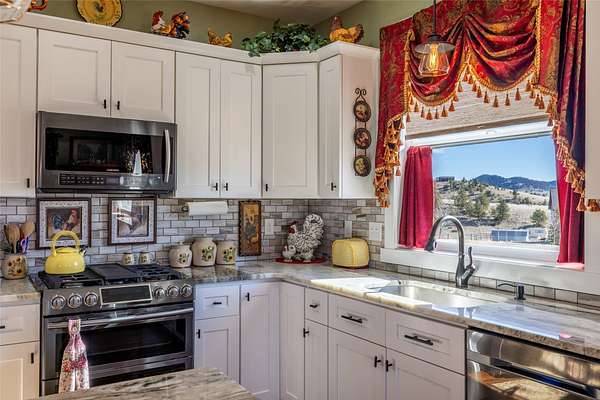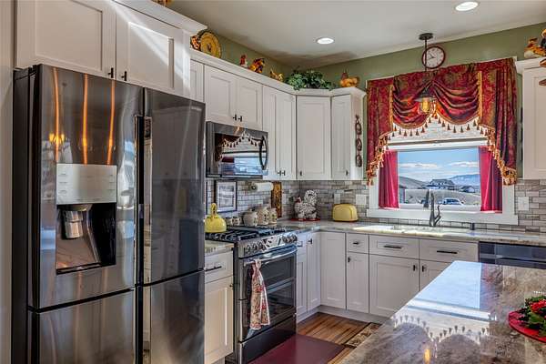 This well-kept ranch-style home features main floor living with a luxurious owner's suite, and two additional bedrooms. It is spacious and bright with 9' ceilings throughout, and a tray ceiling in the living room which also boasts a gas fireplace. The kitchen is a chef's delight with high end appliances including a gas range, granite counter tops, kitchen island, and lots of storage in the pantry. The lovely owner's suite has a dual sink vanity, a soaking tub and walk-in shower along with a walk-in closet. One of the bedrooms doubles as an office, and has a built-in Murphy bed. A private well provides plenty of water to garden in the raised beds and keep a lawn green with the underground sprinklers. The outdoor space which takes in the spectacular views includes a patio with pavers, a gazebo covered patio with adjacent fire ring, and a fenced yard. Two sheds including a custom built 14 x 20 shed are included, and there is room to park your RV, boat and trailers.