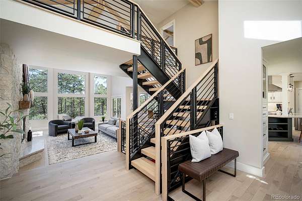 Inside, soaring vaulted ceilings with striking poplar beams and floor-to-ceiling windows fill the home with natural light, while solid maple hardwood flooring extends throughout the main and upper levels.A beautifully reimagined steel and maple staircase serves as a true architectural centerpiece. The light-filled family room showcases a stunning Greek limestone fireplace creating a warm and elegant focal point. The kitchen is both functional and inviting, featuring a large island, Quartzite countertops, and seamlessly flows into the dining area—ideal for entertaining. The main level also includes a spacious bedroom, a three-quarter bath, and a practical mudroom for everyday organization. Upstairs, a bright loft offers the perfect space for a home office or reading retreat. The primary suite provides a serene escape with its own fireplace, private balcony, and spa-inspired bath complete with dual sinks, a soaking tub, heated floors, and an oversized walk-in closet with custom built-ins. Additional bedrooms include a secondary suite with its own bath and walk-in closet, plus a third bedroom tucked away for added privacy. A large laundry room with storage and utility sink adds daily convenience. The lower level is designed for entertaining, offering a spacious family room ideal for movie nights, a bonus area for games or recreation, a wet bar, and a full bathroom, along with a third striking fireplace—perfect for cozy winter evenings. Equestrian-ready amenities include a four-stall barn with tack room, bathroom, pull-through garage parking, and a round pen. Above the barn, guest quarters offer an apartment with two bedrooms and one bath—perfect for visitors. Don’t miss this one-of-a-kind property that has it all.