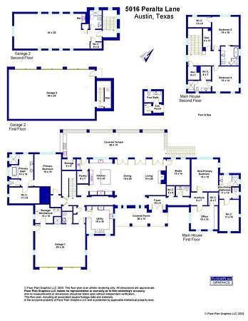 Across the motor court sits an oversized detached 3-car garage — ideal for the car enthusiast — with a +/- 1,113 sq. ft. guest apartment above. Complete with a full bath and kitchenette, this flexible space functions beautifully as guest quarters, creative studio, rehearsal room, office, or private retreat.