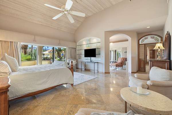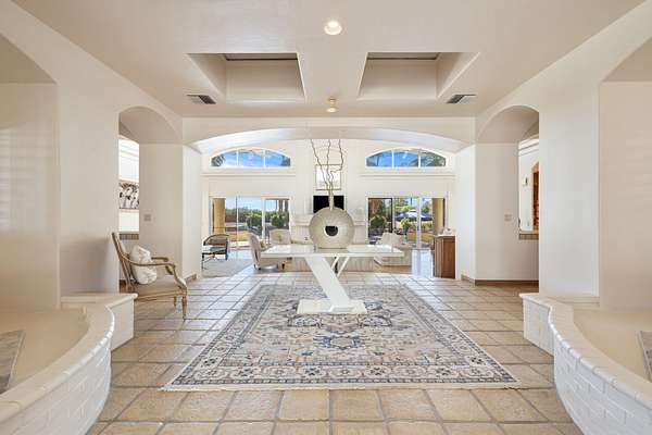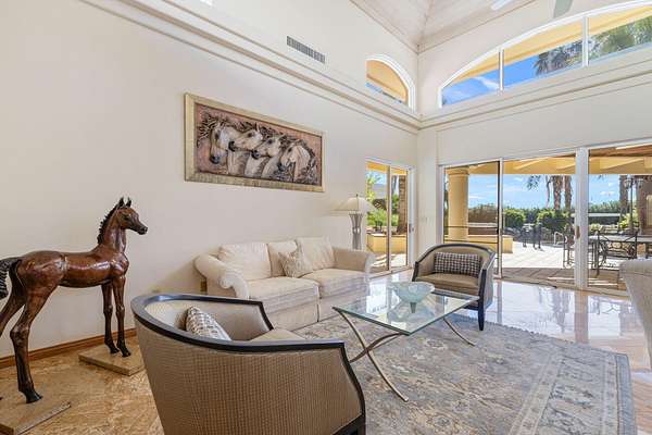 Welcome to Vista Montana Acres, a 2.5 acre equestrian estate comprised of 2 properties. The first is a spacious 5 bedroom, 4.5 bath home with stunning vaulted ceilings, an open concept kitchen with upgraded Viking appliances, separate formal dining and living rooms, wet bar, 3 fireplaces and a two room master retreat with spacious en suite containing a spacious walk in closet, large glass enclosed shower, separate soaking bathtub and gorgeous exterior views including the panoramic southwest mountain scenery that surrounds. The second house is comprised of a 2 bed, 2 bath guest house containing a kitchenette and private laundry for added convenience! Both are tastefully furnished with western stylings and separated by a beautiful pool complete with descending rock waterfall, secondary lap pool, above ground spa and built in barbecue area, large covered patio with misters as well as a large fully enclosed grass pasture and covered stable for your equestrian needs. Located on a secluded street surrounded by lush landscaping for ultimate privacy within the exclusive gated community of La Quinta Polo Estates, directly across from Eldorado and the Empire Polo Fields, Coachella Valley's premier destination for world-class polo competitions. Available now for short or long term stays in excess of 30 days .