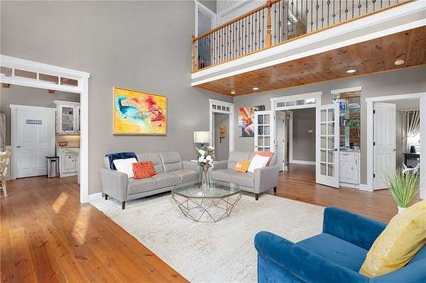 Inside, the home boasts beautiful heart pine floors, wood-beamed ceilings, and a warm rustic charm throughout. The spacious kitchen and dining area flow seamlessly into a stunning two-story great room with a stone fireplace. A full basement provides additional living space, including an office and full bath--perfect for guests, work-from-home, or multigenerational living.