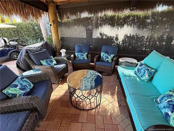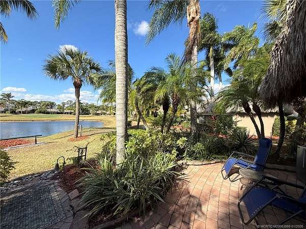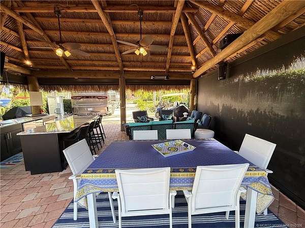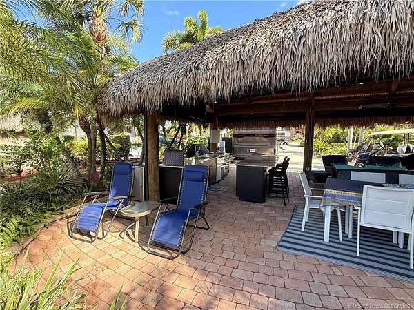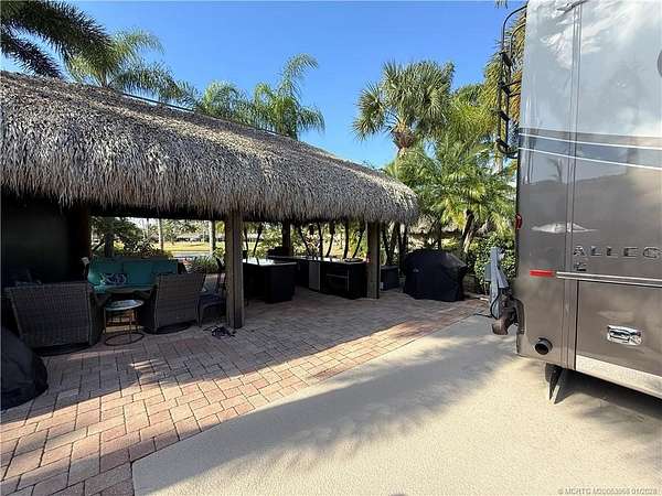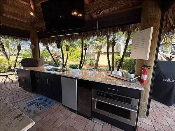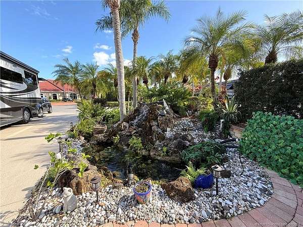 Located on the large lake with double fountains, this is truly one of the most exceptional lots in the resort. A breathtaking double-waterfall pond on property creates a serene, resort-style backdrop and serves as the property's stunning focal point. Spanning an expansive 3,499 square feet, this lot offers multiple, thoughtfully designed entertaining spaces-perfect for both lively gatherings and quiet relaxation. The oversized tiki hut is equipped with remote-controlled screens, allowing for effortless comfort and seamless indoor-outdoor living in any weather. A large bar with generous seating anchors the space, creating the ultimate setting for hosting. The built-in outdoor kitchen blends style and function with upgraded cabinetry, a wine refrigerator, built-in oven, and ample counter space Recently refreshed landscaping and low-voltage lighting enhance the lush surroundings, while illuminated water features provide a striking ambiance from day into evening.