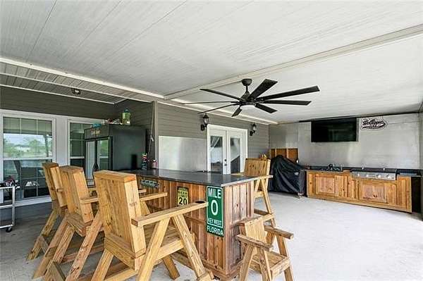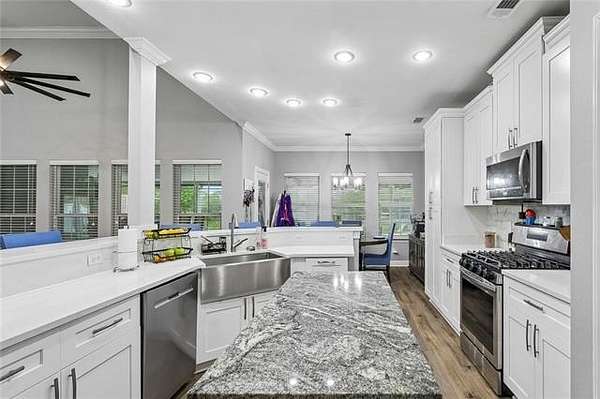 The kitchen features stainless steel appliances, granite countertops, ample cabinetry, and a functional island with a second sink that adds both workspace and convenience. Just off the main living area, a large media room offers additional space for entertaining or relaxing.