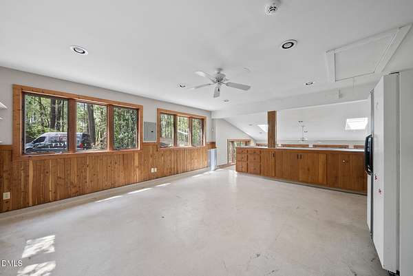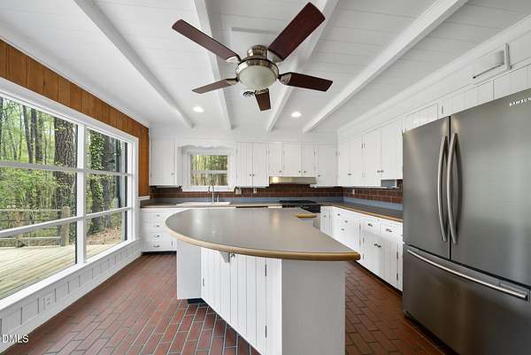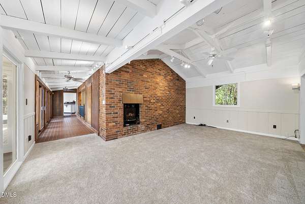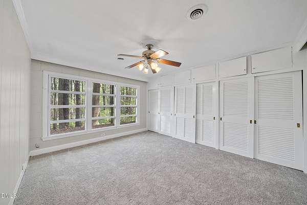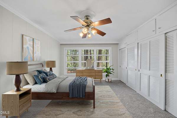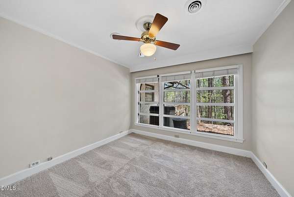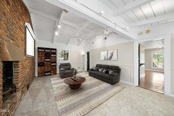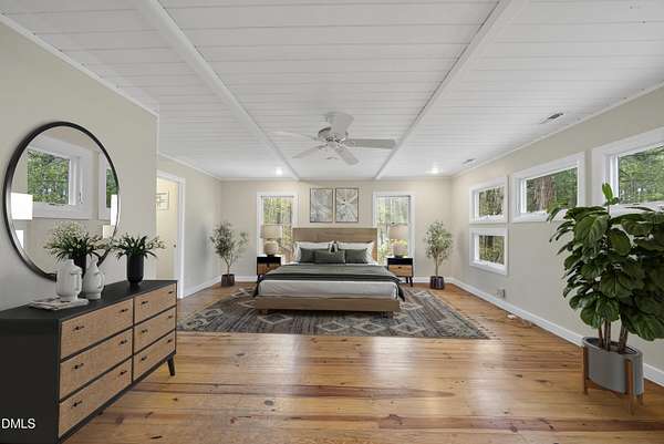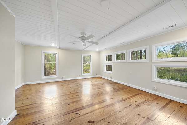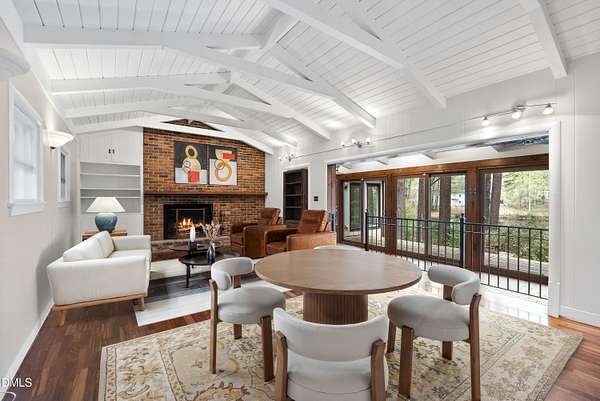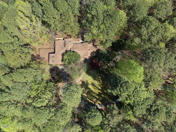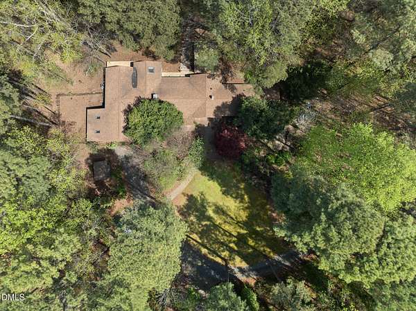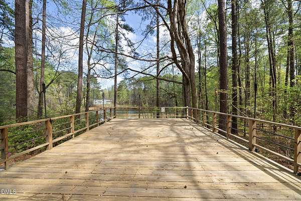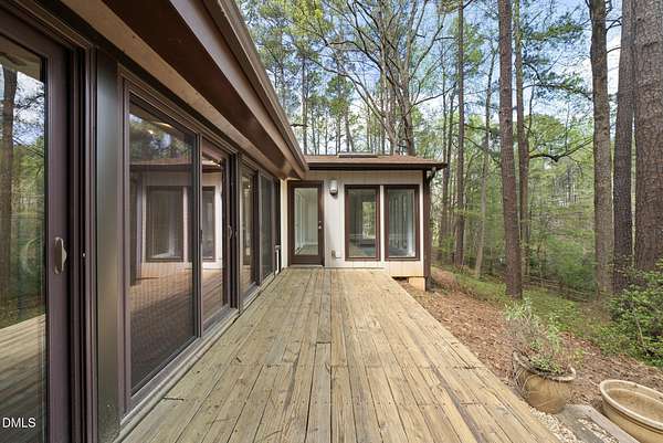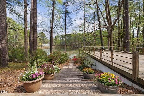 Tucked beneath a canopy of mature hardwoods on 1.69 acres, this mid-century inspired retreat with a private pond offers a rare combination of architectural character, modern updates, and a setting that simply can't be replicated. From the moment you arrive, a gated entrance welcomes you into a quiet, wooded escape where privacy, nature, and design come together effortlessly. Inside, the home lives like a classic ranch with warm wood accents, clean lines, and a layout designed to maximize both comfort and connection to the outdoors. Expansive water views stretch across the entire back of the home, with updated sliding doors and windows drawing your eye straight to the pond, while a sprawling deck creates a seamless extension of the living space--ideal for entertaining or simply taking in the stillness of the water and surrounding trees. The primary suite offers a peaceful retreat with rich pine floors and a custom walk-in closet, while additional bedrooms and flexible living areas provide space for guests, work, or multi-generational living. Outside, the lifestyle continues with a private dock, updated steps to the water, and thoughtfully designed outdoor spaces including a firepit area and ambient patio lighting. The home reflects true pride of ownership with meaningful improvements already in place, including a roof replacement with added insulation for enhanced efficiency, updated HVAC systems with air purification, replaced exterior and sliding doors, an upgraded irrigation system, exterior lighting enhancements, and major infrastructure updates such as a recently replaced 40' line to the main line into the septic and multiple water heaters serving different areas of the home . A detached barn/workshop adds versatility for storage, hobbies, or recreational equipment. All of this is set in a highly desirable Raleigh location where you feel completely removed from the pace of the city, yet remain just minutes to everything. This is more than a home-it's a private waterfront setting, a mid-century retreat, and a lifestyle opportunity all in one.