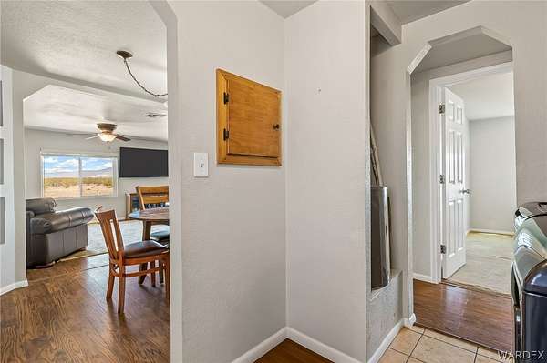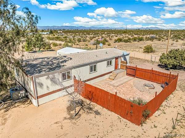 This beautifully remodeled 3-bedroom, 2-bath home sits on 2.55 acres in Golden Valley and offers stunning panoramic desert and mountain views. With 1,288 sq ft of living space, the home features an open floor plan, updated flooring, fresh interior finishes, and plenty of natural light throughout. The kitchen offers ample cabinet space, modern appliances, and a window overlooking the surrounding desert landscape. The spacious living and dining areas provide a comfortable layout for everyday living and entertaining. Outside, the property offers endless possibilities with 2.55 acres of usable land, perfect for animals, toys, RVs, or creating your own desert retreat. A detached garage/workshop provides great storage and workspace, while the fenced yard area and covered porch offer a private place to relax and enjoy the quiet surroundings. Property features all-electric utilities, septic system, and hauled water with a storage tank (2,500 gallons), water haul trailer that holds 250 gallons and well pump system. Plenty of space for additional outbuildings, gardening, or expanding your homestead. If you're looking for privacy, wide-open space, and beautiful desert views, this Golden Valley property is ready to welcome you home.