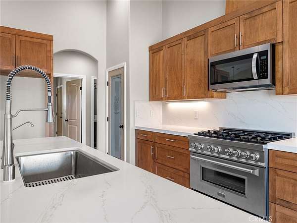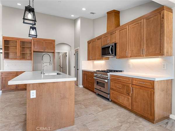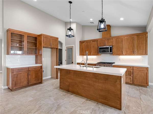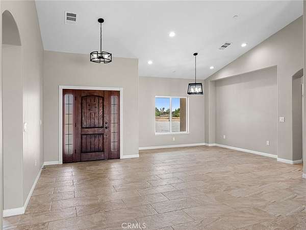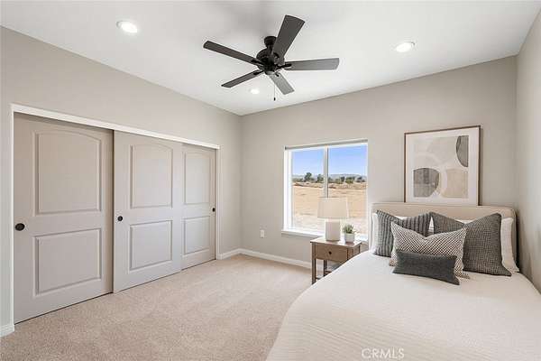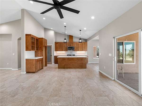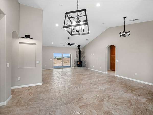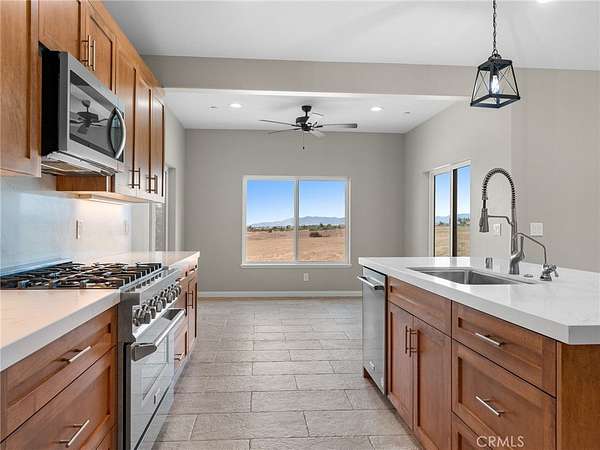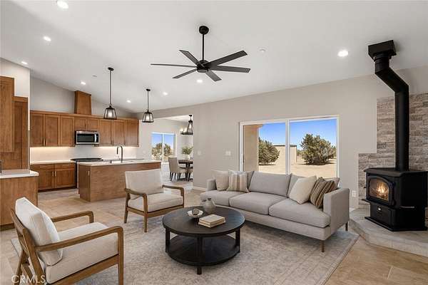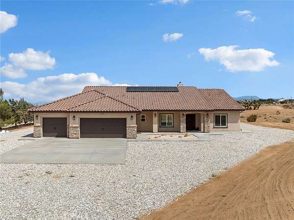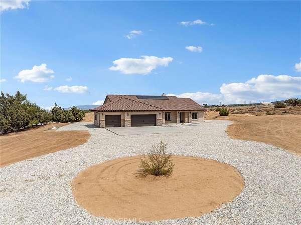 Welcome to this custom-built home in the South foothills of Phelan, less than 1.5 miles from schools and shopping, with breathtaking mountain views and convenient access to the paved intersection of Johnson Rd. and Neilson Rd. Built in 2024 and nestled on a spacious lot in Snowline School District, this home combines thoughtful craftsmanship with energy efficiency and modern comforts. Inside, you'll find a bright open-concept floor plan with a breakfast nook, formal dining area, and a chef's kitchen featuring a commercial style Z-Line 36" 6-burner gas range with electric convection oven, stainless steel appliances, Ashwood shaker cabinets with soft-close drawers, and sleek quartz countertops. A large pantry adds extra storage. The living area is anchored by a custom wood-burning stove with a flat rock hearth, creating the perfect spot to gather on cool winter nights. The private master suite is a retreat of its own, complete with a soaking tub, tiled shower, toilet room, walk-in closet, and access to its own 27x15 covered patio. Two additional bedrooms offer comfort with carpeted flooring, while the rest of the home features durable custom tile and flat black fixtures for a modern touch. Designed with efficiency in mind, this property includes paid off solar panels, an owned propane tank, a Culligan water softener, RO drinking water system, tankless water heater, upgraded stylish prohibition era wood grain weather resistant front door, and full-perimeter gutters draining into underground drainage. Cooling and airflow are enhanced with ceiling fans throughout. Outdoor living is a highlight with a 15x50 covered back patio off the living room, complete with propane connection for a grill or outdoor kitchen, making it perfect for entertaining. The 3-car garage is oversized at 835 sq. ft., with insulated doors, LED lighting, and ample storage. With its terra-cotta tile roof, custom stonework, and high-end finishes inside and out, this home is truly move-in ready--offering peace, privacy, and timeless style in a neighborhood of other custom homes.