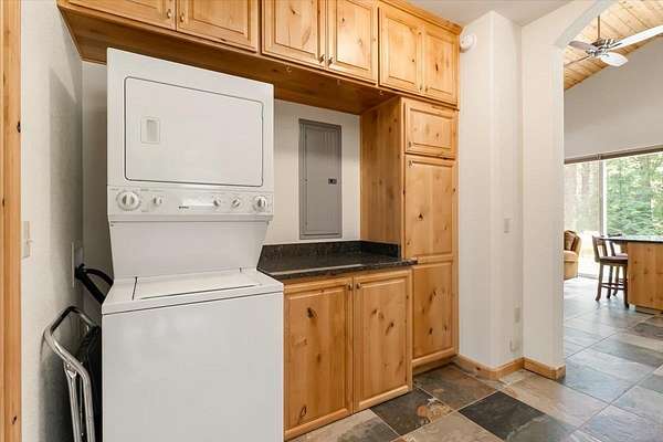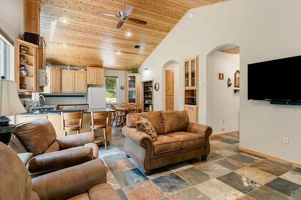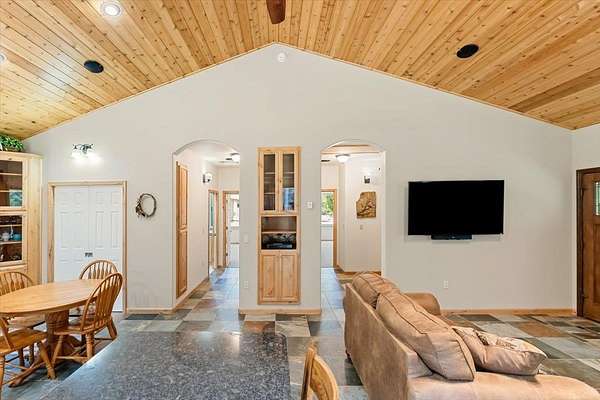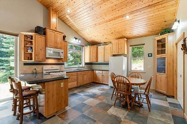 - Built-In Hutch, Custom Cabinets, Double Sink, French Doors, Granite Counter Tops, Lazy Susan, Pantry, Tile Counters, Tile Enclosure, Tile Floors, Vaulted Ceilings
