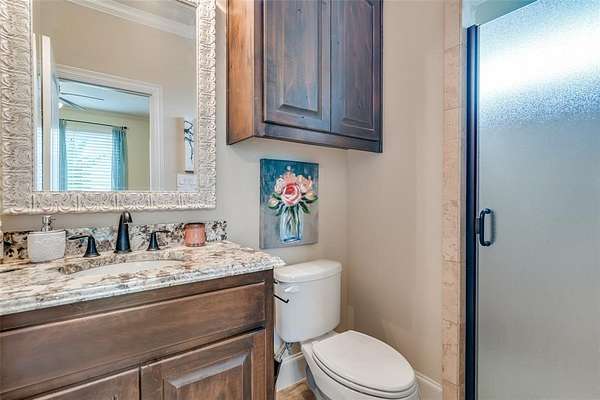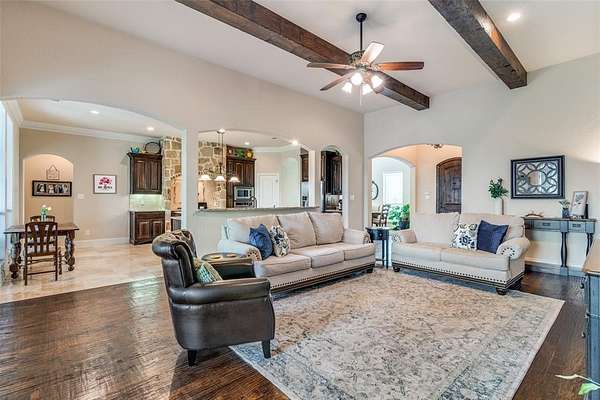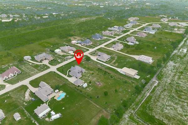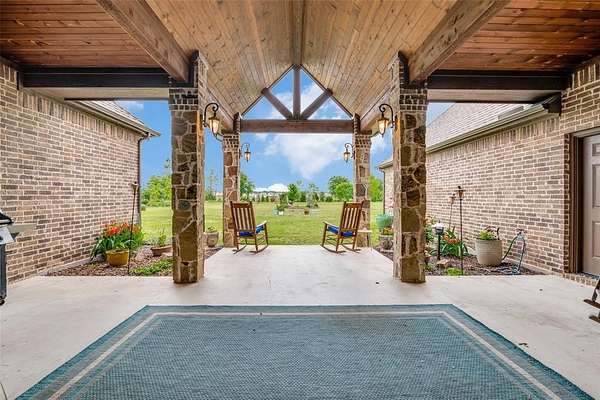 Beautiful custom-built home, set on 1.7 acres within a small, quiet gated community, is a must see for discerning buyers. As you enter, you are greeted by an upscale interior adorned with rich hardwood flooring, beautiful lighting and a stunning beamed ceiling in the family room. The chef's kitchen, a true centerpiece, features an oversized island, granite countertops, custom cabinetry, a pot filler, and premium stainless-steel appliances, perfect for culinary enthusiasts. The home offers spacious living areas, and a sophisticated office that includes a walk-in closet so it can transform to a 4th bedroom. The oversized primary suite provides sequestered privacy with beautiful details and large windows looking over the large backyard. There is another extra large bedroom that provides privacy that could be perfect for an in-law or guest suite. The oversized utility room has cabinets galore and more. The beautifully covered patio, with a cathedral ceiling, provides a tranquil retreat with gas installed on the patio for an outdoor cooking area if desired. The property boasts an attached three car garages. A detached 780 sf workshop with garage spaces has electricity, water and roughed-in plumbing to easily add a bathroom. Additionally it has ATT fiber and NO MUD tax or PID. Bring your offers. This is luxury living at its most attainable.