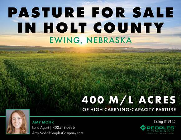 Peoples Company is pleased to present 400 m/l acres of high carrying-capacity pasture in east-central Holt County, Nebraska, located just northwest of Ewing. This property allows for strategic grazing featuring multiple water sources, warm and cool season grasses, and six cross-fenced sections for rotational grazing. Fences have been well-maintained, and cedar trees controlled throughout. Several mature tree groves provide livestock protection. The NRCS strategically designed the cross-fencing system to optimize rotational grazing and sustainability.