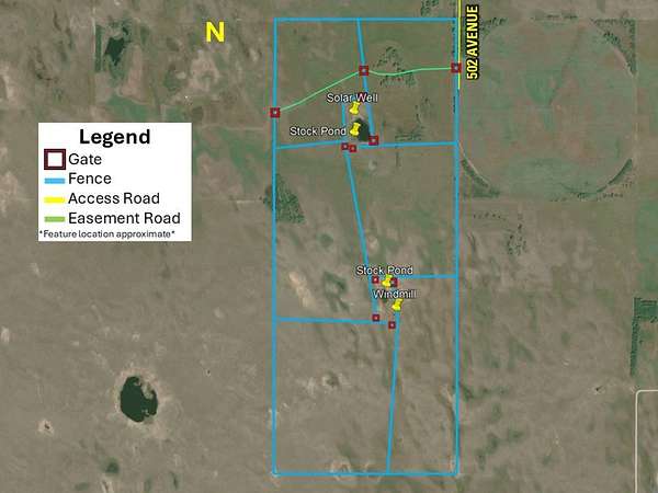 This property has easily and consistently accommodated 100 cow-calf pairs over a five-month grazing season, reflecting an efficient 4-acre per pair stocking rate. Notably, the property has been well managed, and ample grass remains at the end of the grazing season due in part to sectional grazing and ideal soil types. In addition, in recent years, select portions of the pasture were allowed to rest, further strengthening forage stands. A large portion of the perimeter fence is newly installed. Water to the north half of the pasture is provided by a livestock pond and a newly installed solar well with underground overflow. The southern water sources include a livestock pond and a windmill.