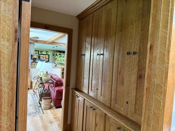 - Ceiling Fans(s), Eat-In Kitchen, Living Room/Dining Room Combo, Open Floorplan, Primary Bedroom Main Floor, Solid Surface Counters, Solid Wood Cabinets, Split Bedroom, Stone Counters, Thermostat, Wet Bar