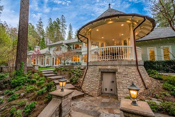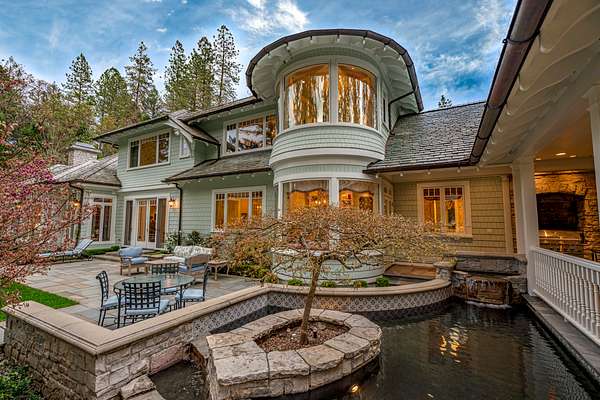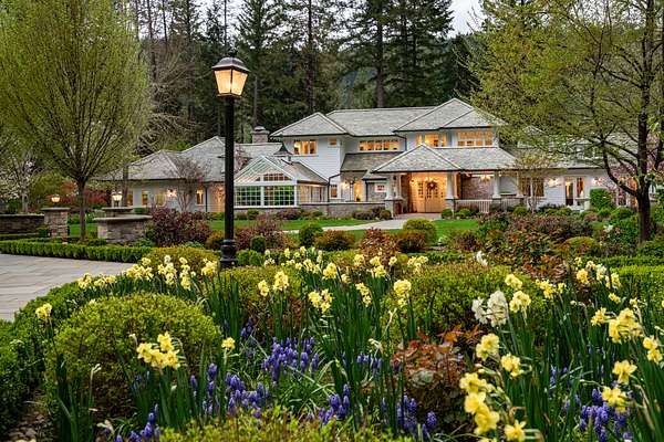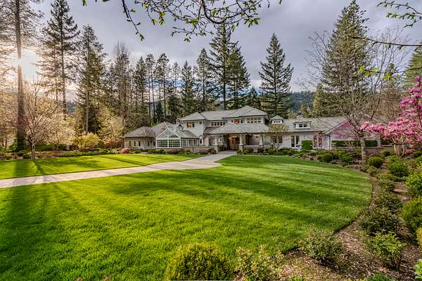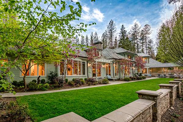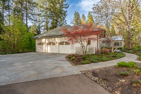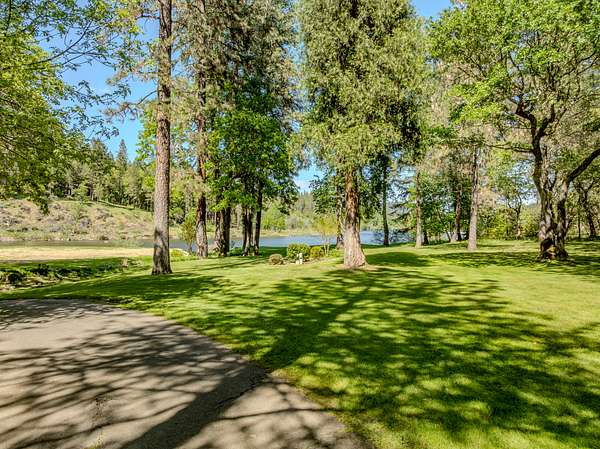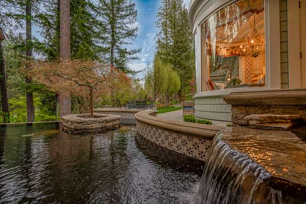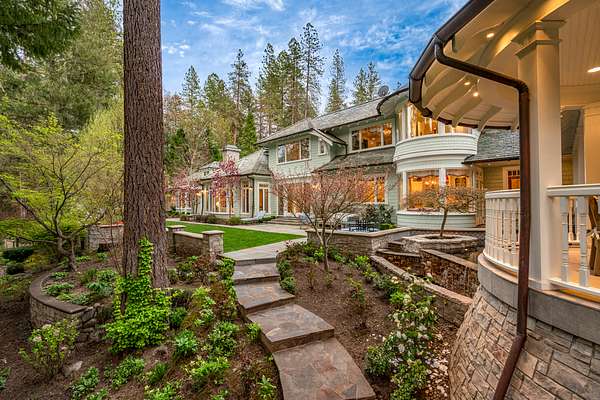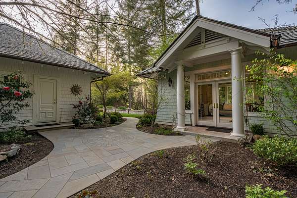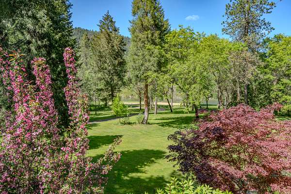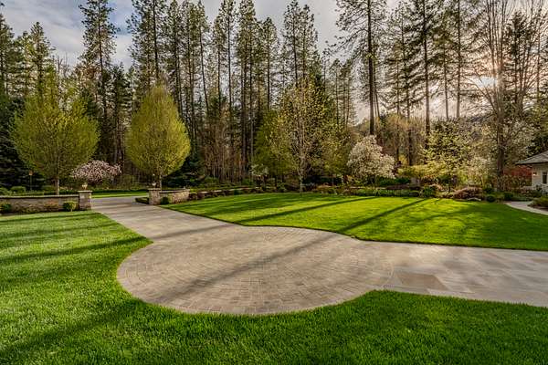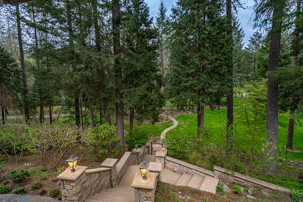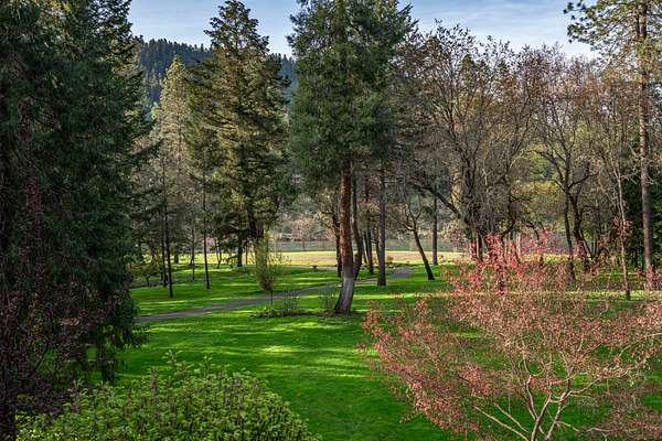 Outdoor Living ~ The home is enhanced by multiple covered exterior living areas, including a welcoming entry porch with water feature, a covered BBQ area, and an elevated gazebo with cold storage beneath. These outdoor spaces are designed for both relaxation and entertaining, with views extending over the manicured lawn and down toward the Rogue River. The home is surrounded by elaborate landscaping, designed for year-round color, texture, and visual appeal. The grounds include vibrant flowering plants, mature trees, and sprawling lawns that are beautifully integrated with hardscaping. A flame-textured Bluestone driveway and walking paths wind through the property, connecting the entry, front yard, back yard, and garden spaces. A formal, cutting flower garden near the home offers additional seasonal beauty and structure.