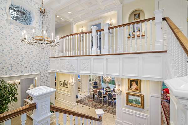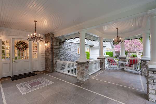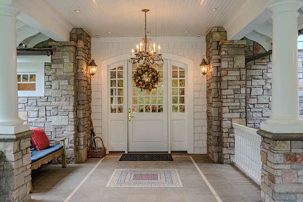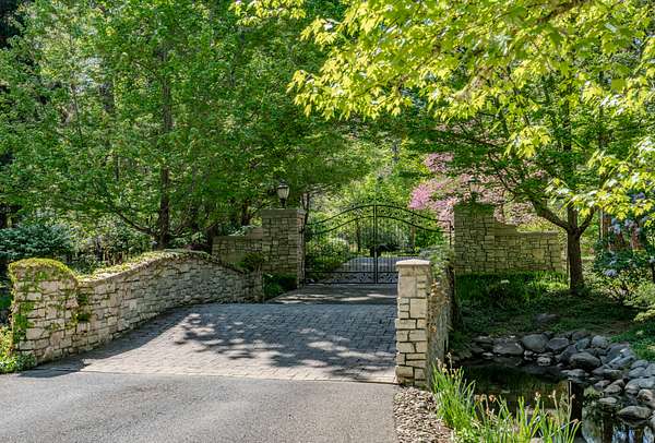 Greeted by a striking European-inspired arched bridge, the entry is flanked by impressive stone columns and a soothing water feature. Ornamental metal paneling spans the entry beyond the arch, marking a grand, yet refined arrival experience. The paved driveway curves gracefully through the grounds and transitions to flame-textured Bluestone, setting the tone for the home's artisan qualities. Meticulously landscaped grounds, draw the eye toward this glorious estate and its distinctive English Country architectural lines.