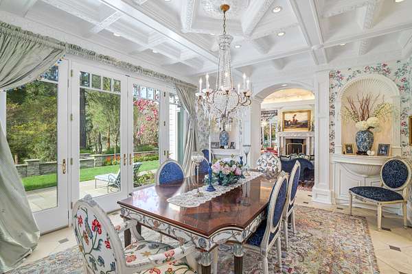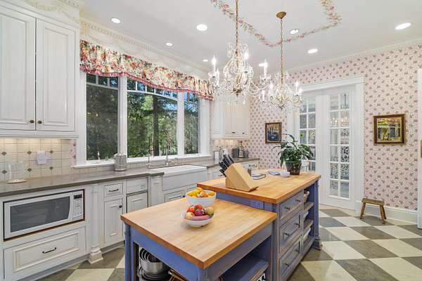 The kitchen is a chef's delight, outfitted with custom hardwood cabinetry, imported limestone countertops, a 4 burner DCS cooktop and griddle as well as double ovens, and a Sub-Zero refrigerator. This inviting space is anchored by a tiered butcher block island.The adjacent breakfast nook features radius windows overlooking the gazebo, another water feature and the meticulous grounds.