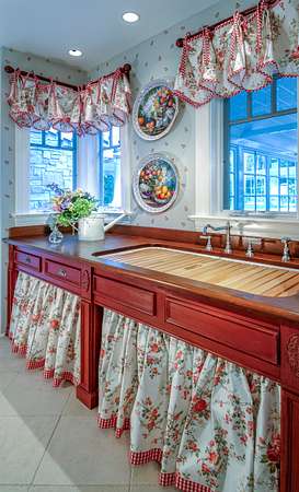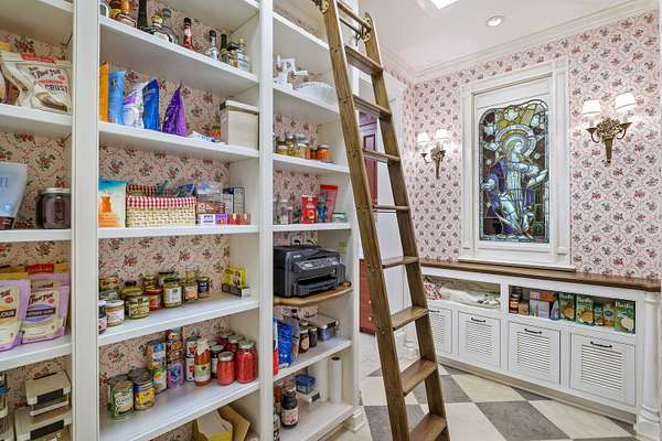 The West wing of the home supports functional and lifestyle needs. A butler's pantry connects the kitchen and laundry room, provides additional cold storage with a full sized Sub-Zero freezer, ample floor to ceiling cabinet storage and artistic stained glass window. The laundry room offers built-ins, extensive storage, a utility sink, as well as a closet outfitted with a drying rack and heater. A custom potting bench with flower cutting station sits at the interior entry to the conservatory; a climate-controlled greenhouse with glass roof panels, radiant heat, programmable lighting and automated irrigation--used for seed propagation and growing citrus and herbs. A well appointed powder room is located directly off the foyer for convenience.