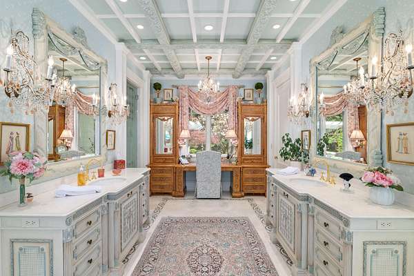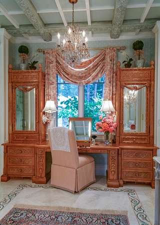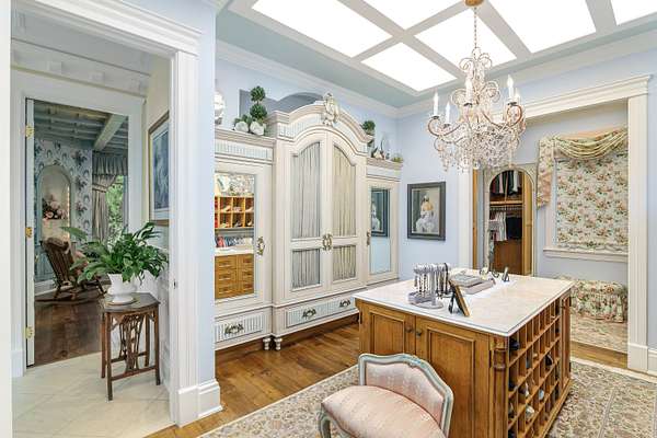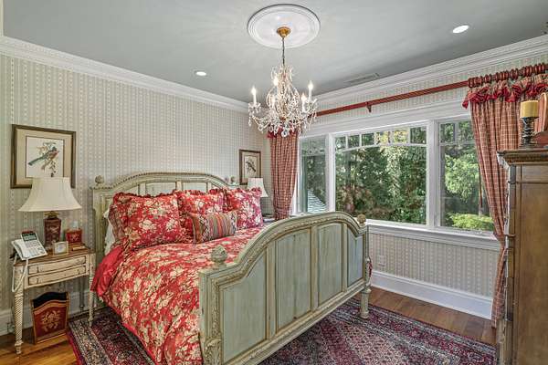 A charming library with hardwood floors, extensive built-ins and a cozy and efficient Rumford fireplace is a fantastic place to snuggle up on a cold day. It captures serene views of the surrounding gardens as is adjacent to the East wing, dedicated to the glorious primary suite. The attention to detail is unparalleled as evidenced by the box beam ceiling, custom built-ins and exquisite en-suite bathroom appointed with marble flooring, a baja-style shower, soothing soaking tub, separate steam shower, custom crafted vanities and a full jewelry cabinet with felt lined drawers. A large walk-in closet/dressing room is beautifully outfitted with built-in clothing and shoe organizers and will please the most discriminating buyer.