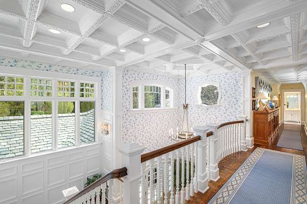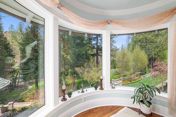 On the upper level, a grand balcony leads to the well appointed and spacious guest bedrooms, each with impressive ceiling details and custom built-ins. Both bedrooms have walnut flooring and incredible views of the park-like setting. A beautifully appointed guest bathroom serves this level, along with a versatile nursery, secondary office or meditation area offering another quiet space for reflection. Also on this floor is a tucked away kid "retreat" with open, versatile space, ideal for creative and imaginative pursuits.
