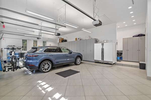 Garage ~ The attached three-car garage is fully finished with tile flooring, built-in cabinetry, and three insulated wood-clad doors. It includes a dog washing station with a custom pull-out ladder, a dedicated storage room for tools or projects, and an exterior-access half bath, ideal for use while outdoors or working in the garden.