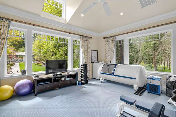 Detached Gym ~ Just steps from the primary suite, the property features a detached workout space that reflects the same architectural styling and material quality as the main residence. The structure is fully finished and climate-controlled, offering a private and convenient wellness space. Its proximity to the home's East wing allows for seamless integration into daily routines while maintaining a sense of separation and retreat. This space could be well suited to a number of other uses including a private office, overflow living or additional hobby space.